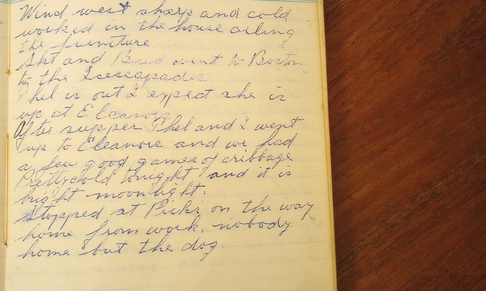 9th day- 356 days follow Wind west sharp and cold. Worked in the house oiling the furniture. Ski and Bud went to Boston to the Ice Capades. Thel is out. I expect she is up at Eleanor’s. After supper Thel and I went up to Eleanor’s and we had a few good games of cribbage. …