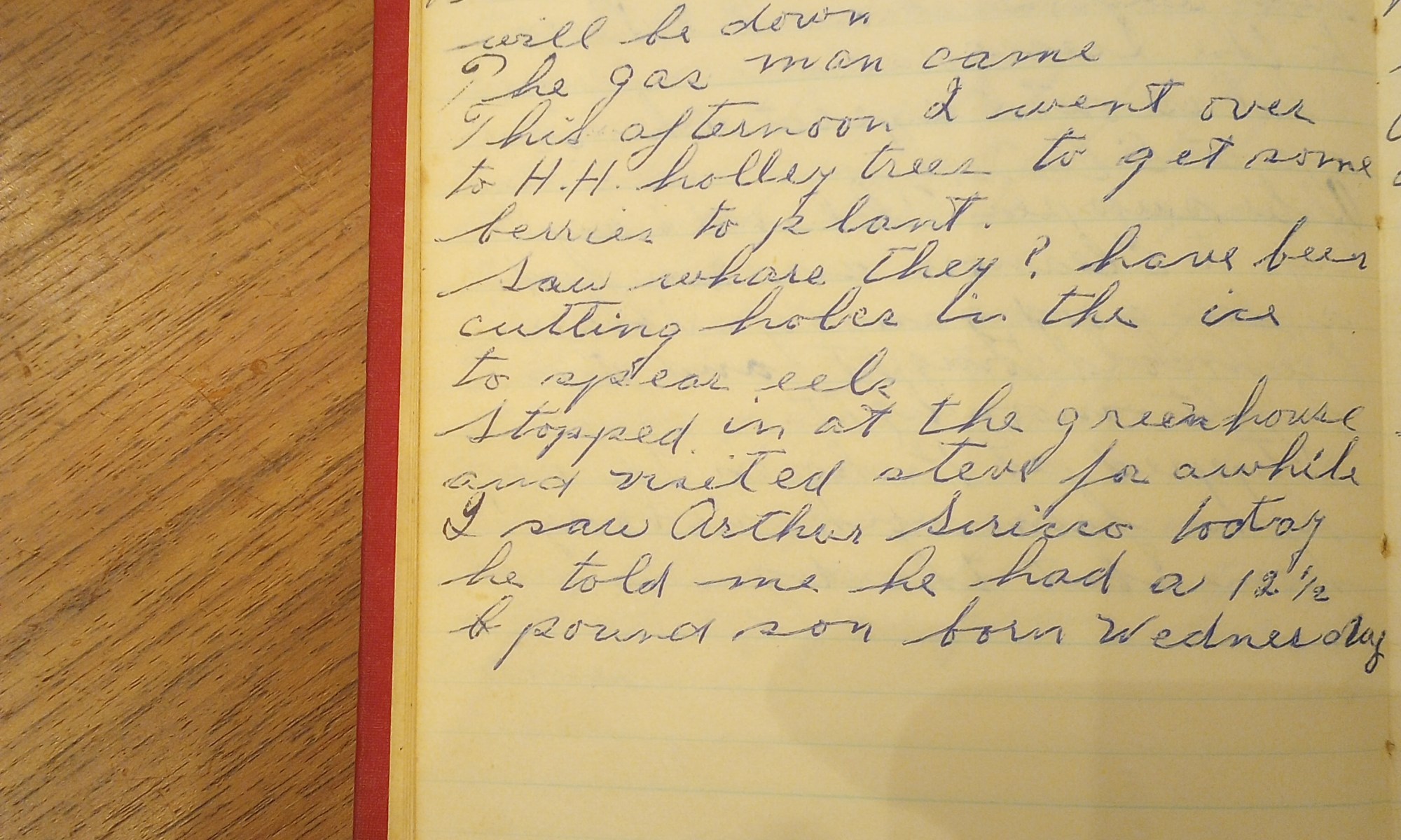 10th day- 355 days follow Fair and cold. Got the house ready for this weekend. I don’t know who will be down. The gas man came. This afternoon I went over to H.H.’s holly trees to get some berries to plant. Saw where they ? have been cutting holes in the ice to spear eels. …