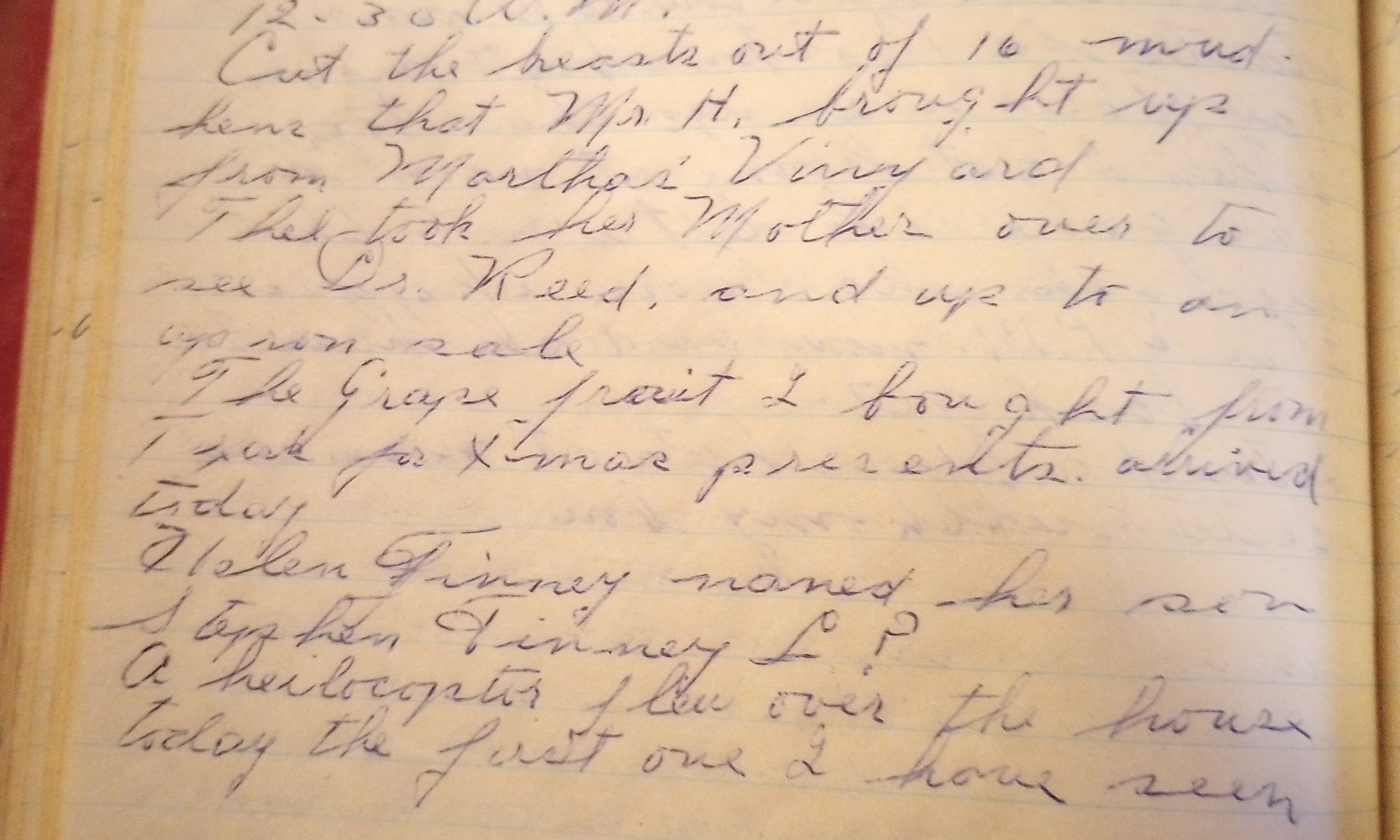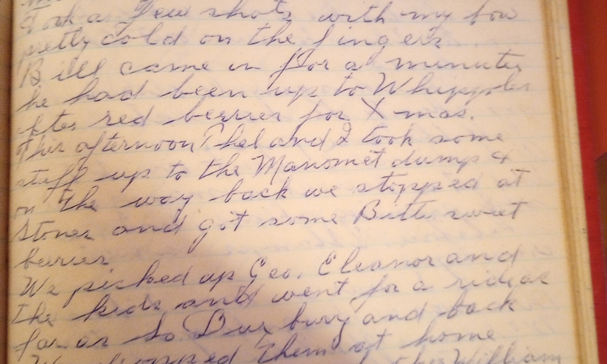 354th day- 11 days follow Cloudy and cool. The carpenter was on the job. Mary Foley was up on the hill today. Mr. Delano finished up tonight. Thel and I took a Xmas tree up to Eleanor’s. Gave Thel $220.00 today. Bill Whiting and Lottie came up after supper and stayed about three hours getting …