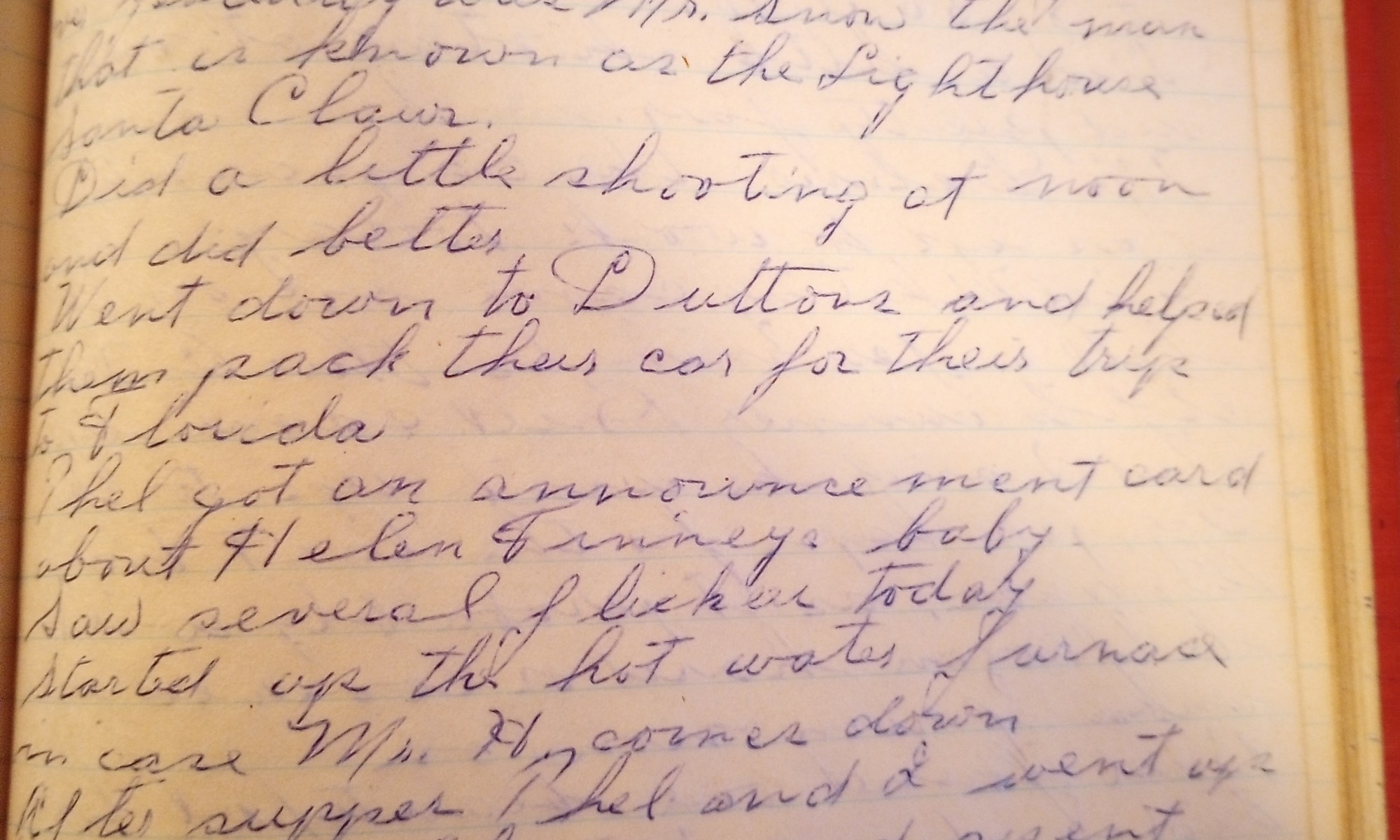 347th day- 18 days follow Light showers this A.M. Cleared off fine. Carpenter on the job today. I heard that helicopter that flew over yesterday was Mr. Snow the man that is known as the Lighthouse Santa Claus.* Did a little shooting at noon and did better. Went down to Dutton’s and helped them pack …