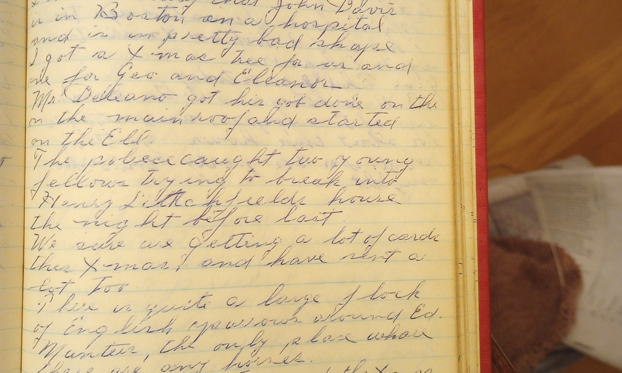 353rd day- 12 days follow Fair and cold today. The carpenter was on the job. Cleaned up rubbish all day. I heard today that John Davis is in Boston at a hospital and is in pretty bad shape. I got my Xmas tree for us and one for Geo. and Eleanor. Mr. Delano got his …