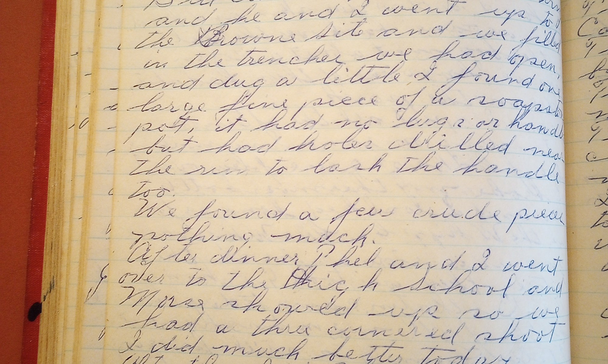 342nd day- 23 days follow Fair and warm, fine day for this season of the year. Geo. and Marie stopped in this morning for a few minutes. Bill came up this morning and he and I went up to the Browne site and we filled in the trenches we had opened, and dug a little. …