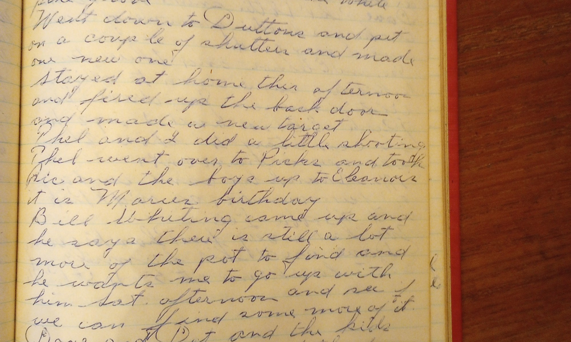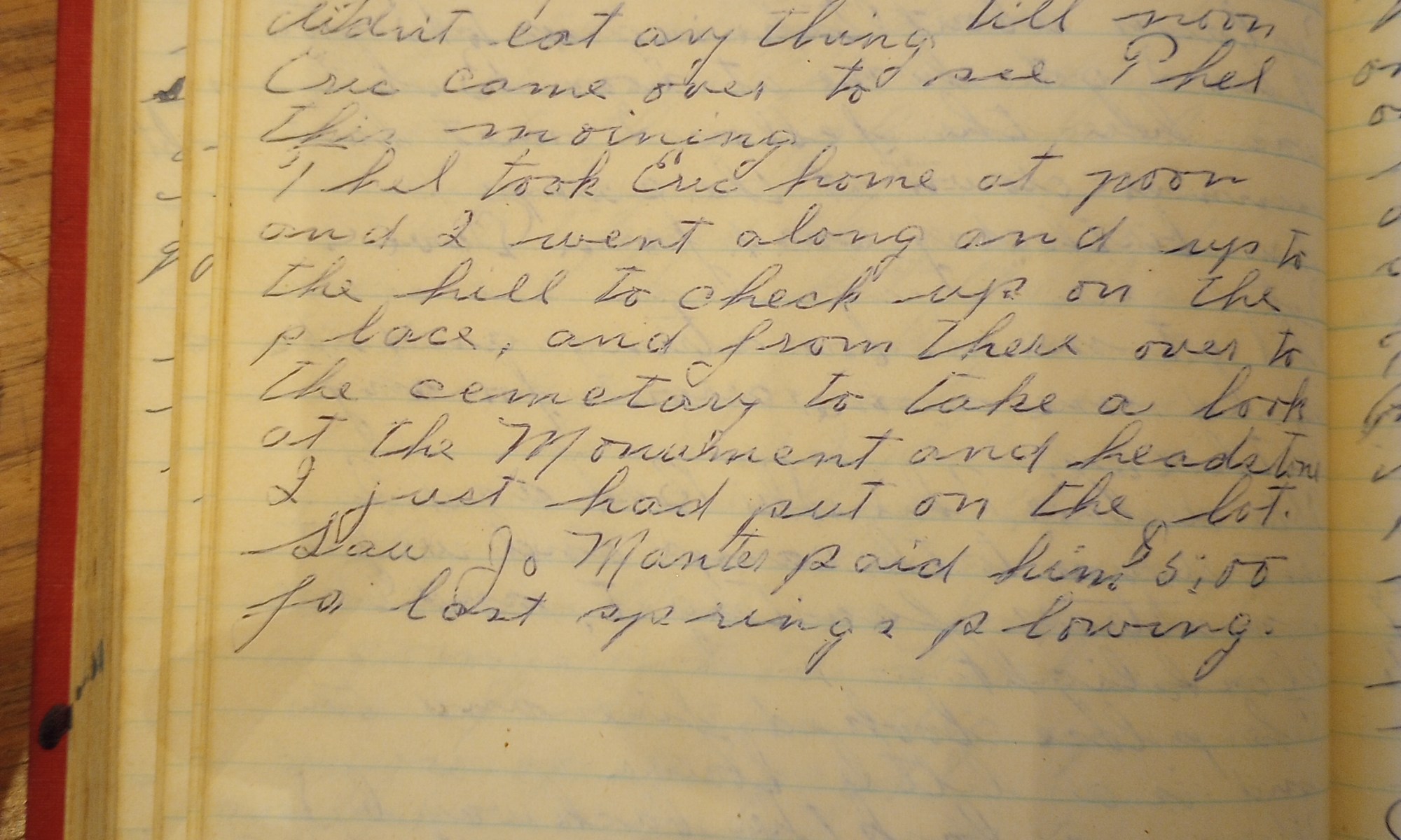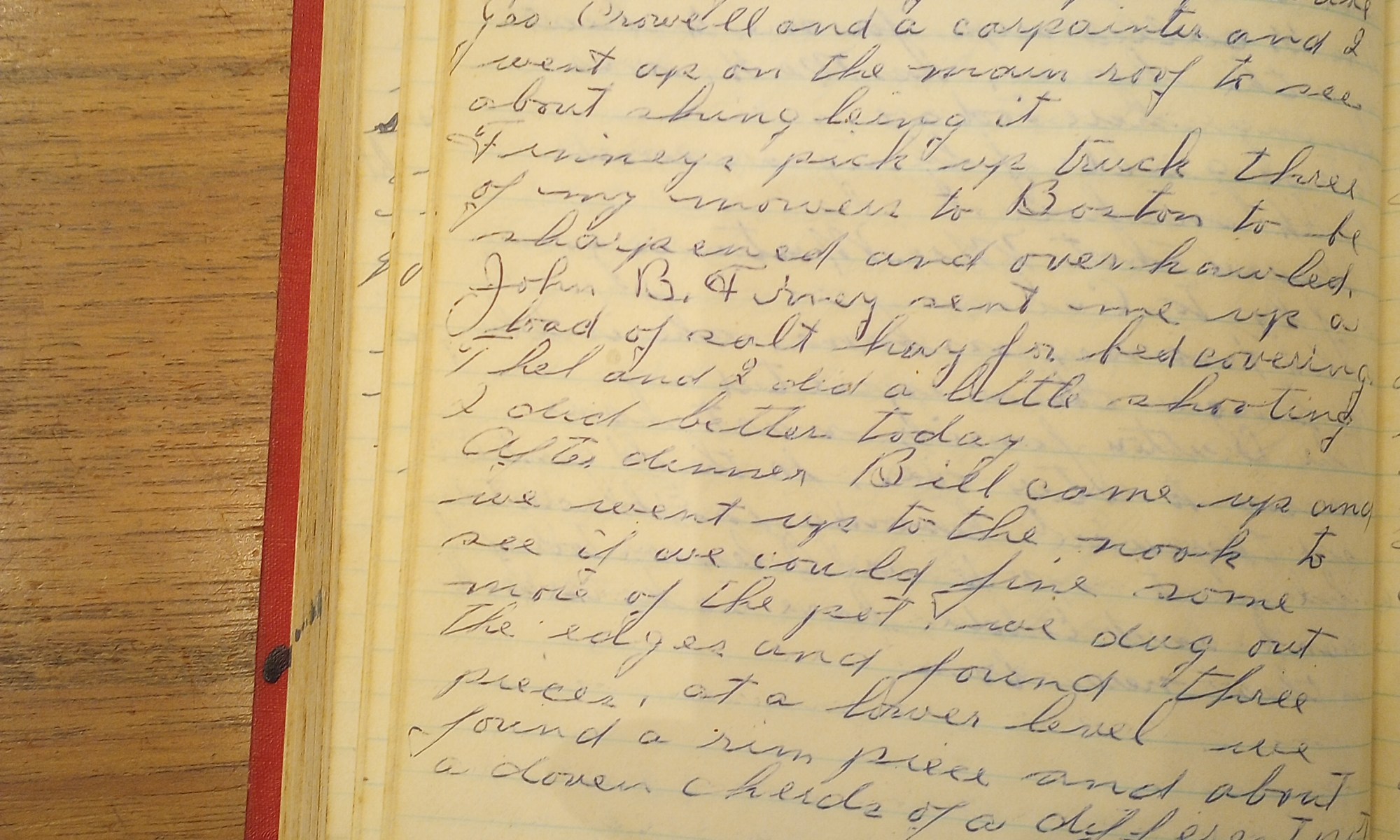 334th day- 31 days follow When I got up on the hill this A.M. Richard Greenwood was there. He said he saw a buck deer in the road in front of Shipley’s drive. Geo. Crowell and a carpenter and I went up on the main roof to see about shingling it. Finney’s pick up truck …