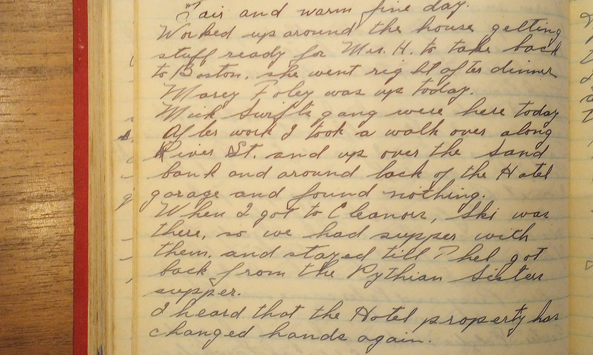 316th day- 49 days follow Fair and warm, fine day. Worked up around the house getting stuff ready for Mrs. H. to take back to Boston. She went right after dinner. Mary Foley was up today. Mick Swift’s gang were here today. After work I took a walk over along River St. and up over …