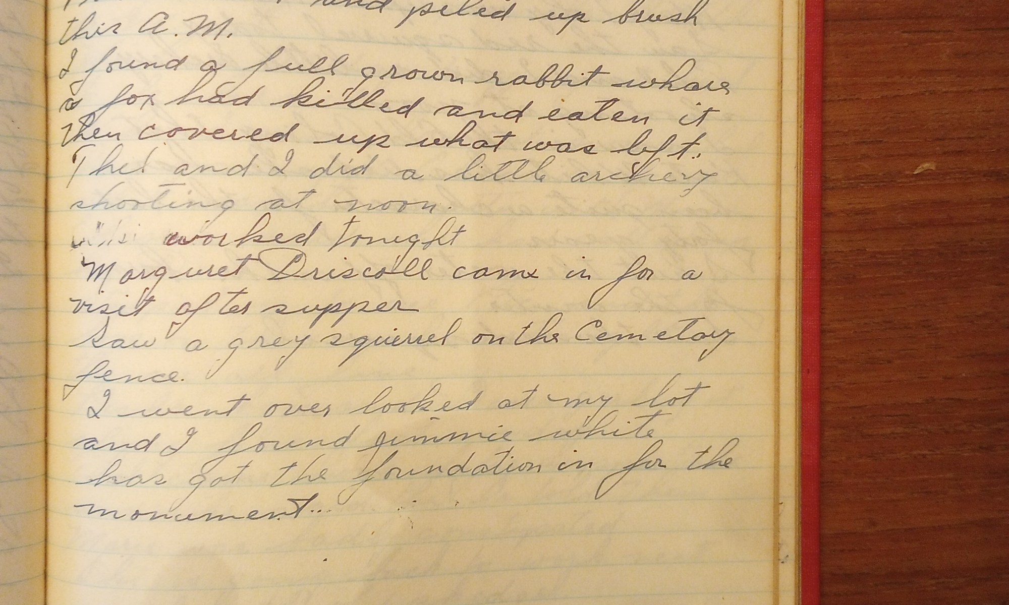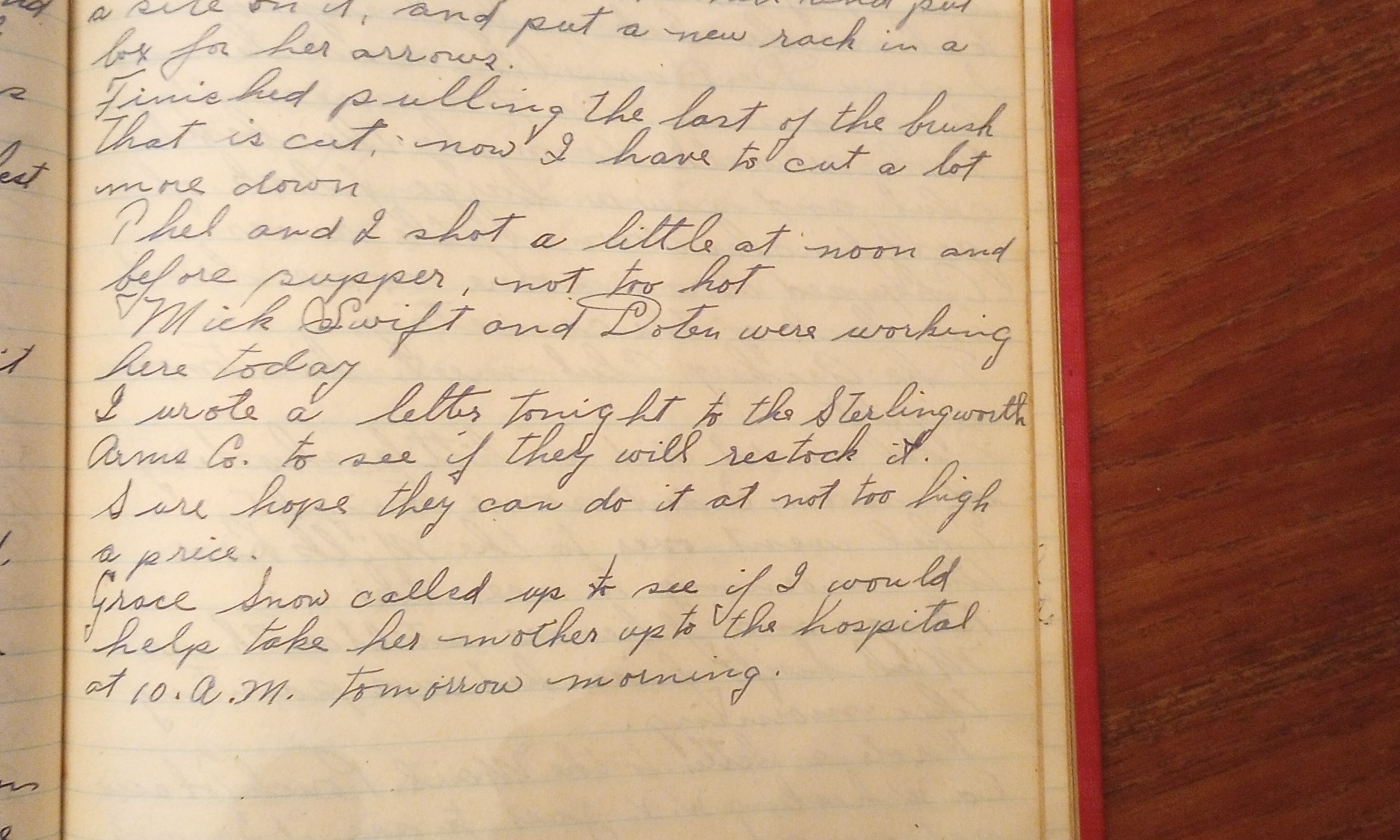 317th day- 48 days follow Fair and warm, fine day. Pulled out and piled up brush this A.M. I found a full grown rabbit where a fox had killed and eaten it then covered up what was left. Thel and I did a little archery shooting at noon. Ski worked tonight. Margaret Drdiscoll came in …