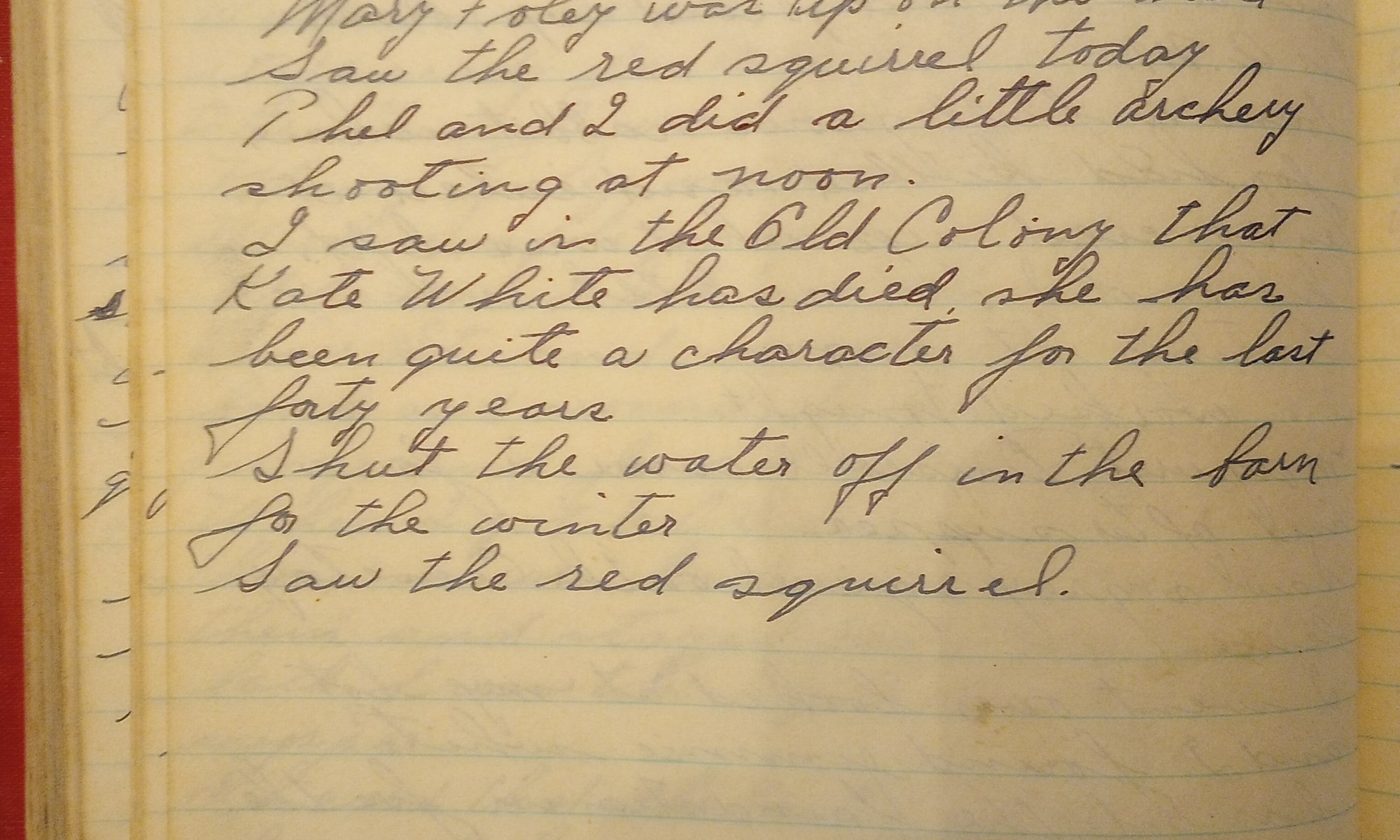 318th day- 47 days follow Fair and warm. Mary Foley was up on the hill. Saw the red squirrel today. Thel and I did a little archery shooting at noon. I saw in the Old Colony that Kate White has died. She has been quite a character for the last forty years. Shut the water …