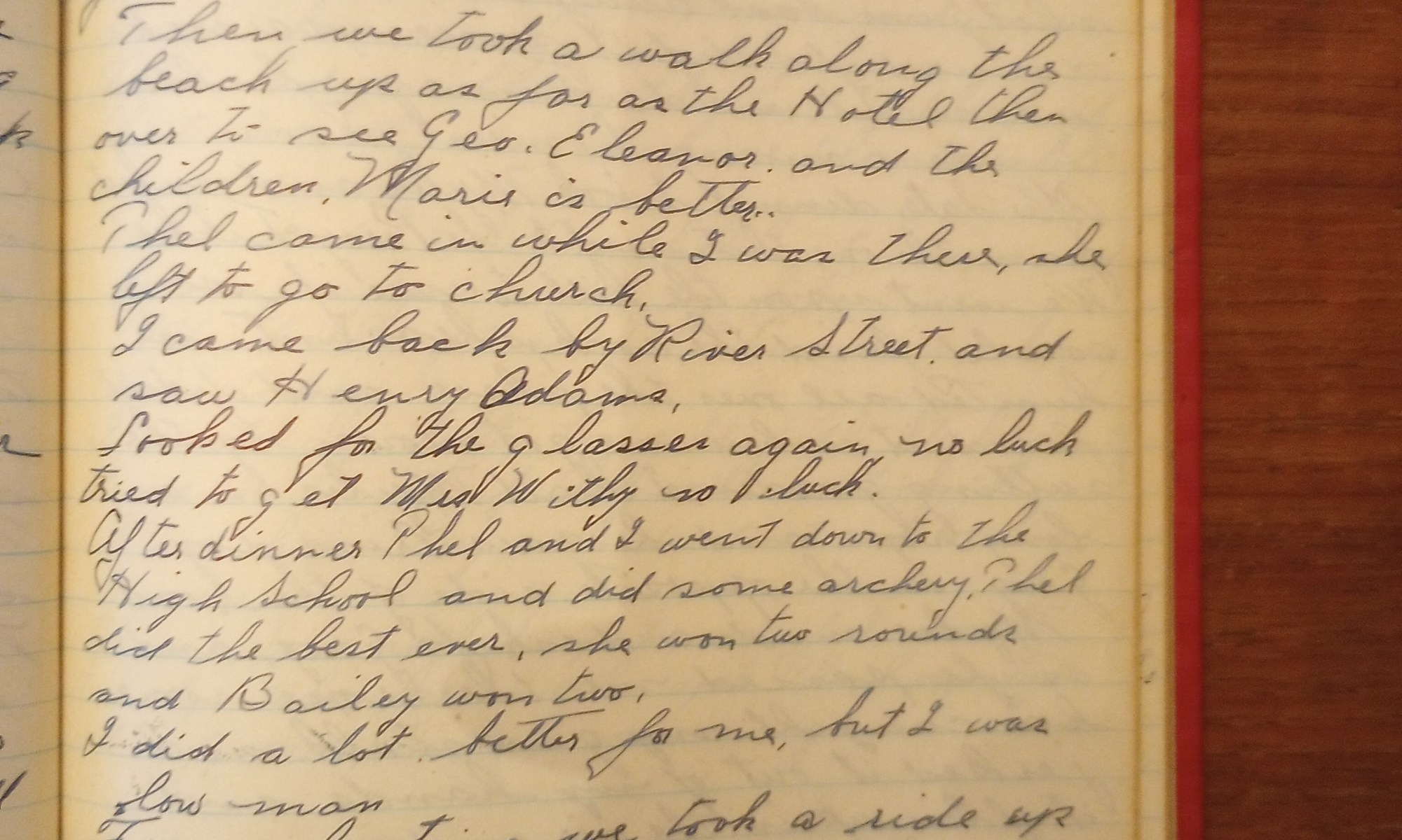 321st day- 44 days follow Cloudy and warmer. Got up first and took Myles with me. We went up on the hill and looked for Mrs. Withington’s glasses, didn’t find them. Then we took a walk along the beach up as far as the Hotel then over to see Geo., Eleanor, and the children. Marie …