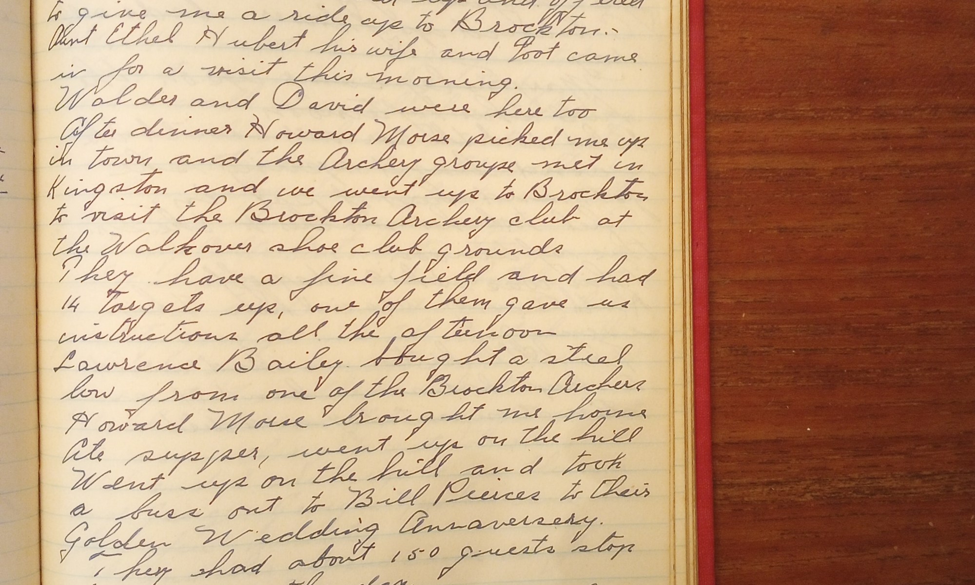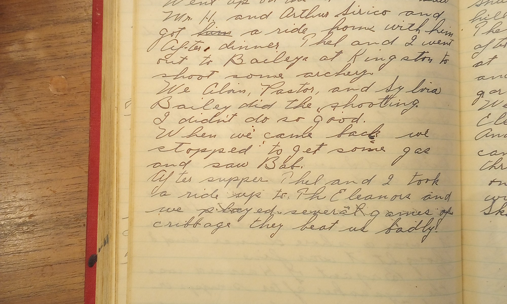 286th day- 79 days follow Fair and cool, fine day. Went up on the hill and saw Mr. H. and Arthur Sirrico and got a ride home with him. After dinner Thel and I went out to Bailey’s at Kingston to shoot some archery. We, Alvin, Pastor, and Sylvia Bailey did the shooting. I didn’t …