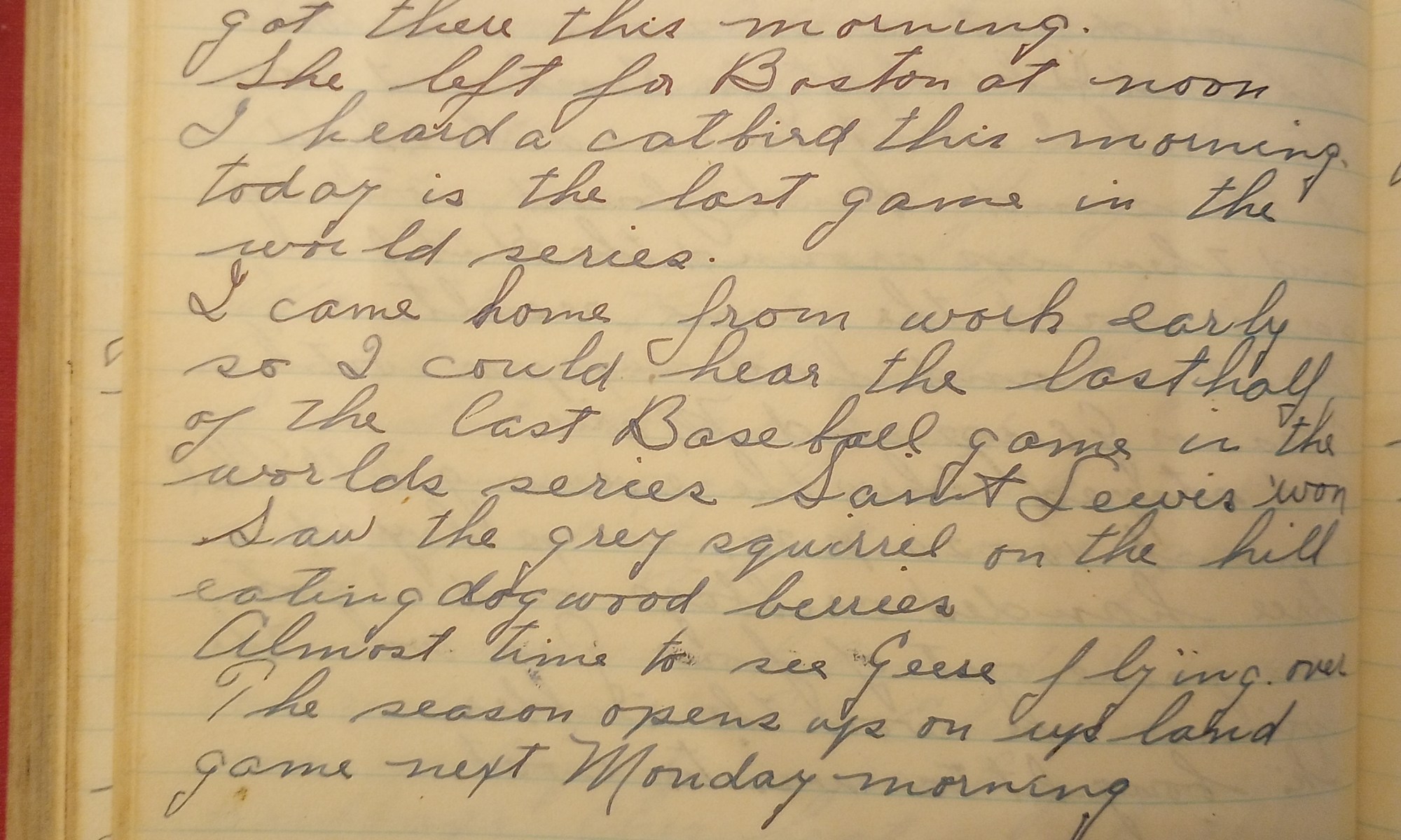 288th day- 77 days follow Fair and cool, fine day. Mrs. H. was on the hill when I got there this morning. She left for Boston at noon. I heard a catbird this morning. Today is the last game in the World Series. I came home from work early so I could hear the last …