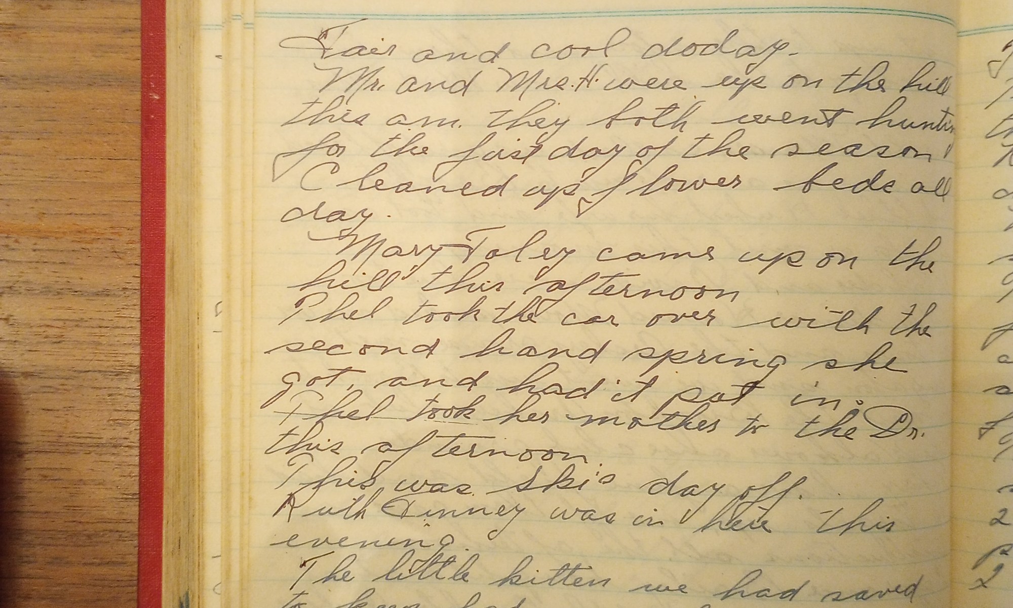 294th day- 71 days follow Fair and cool today. Mr. and Mrs. H. wre up on the hill this A.M. They both went hunting for the first day of the season. Cleaned up flower beds all day. Mary Foley came up on the hill this afternoon. Thel took the car over with the second hand …