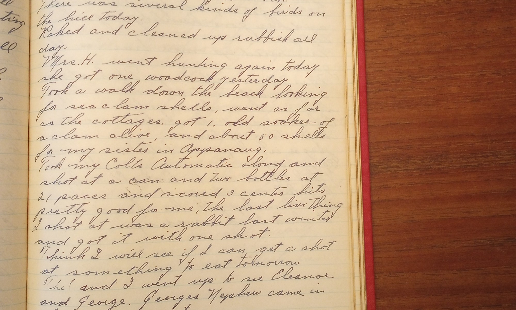 295th day- 70 days follow Fair and cool. Fine day to work. There was several kinds of birds on the hill today. Raked and cleaned up rubbish all day. Mrs. H. went hunting again today. She got one woodcock yesterday Took a walk down the beach looking for sea clam shells, went as far as …