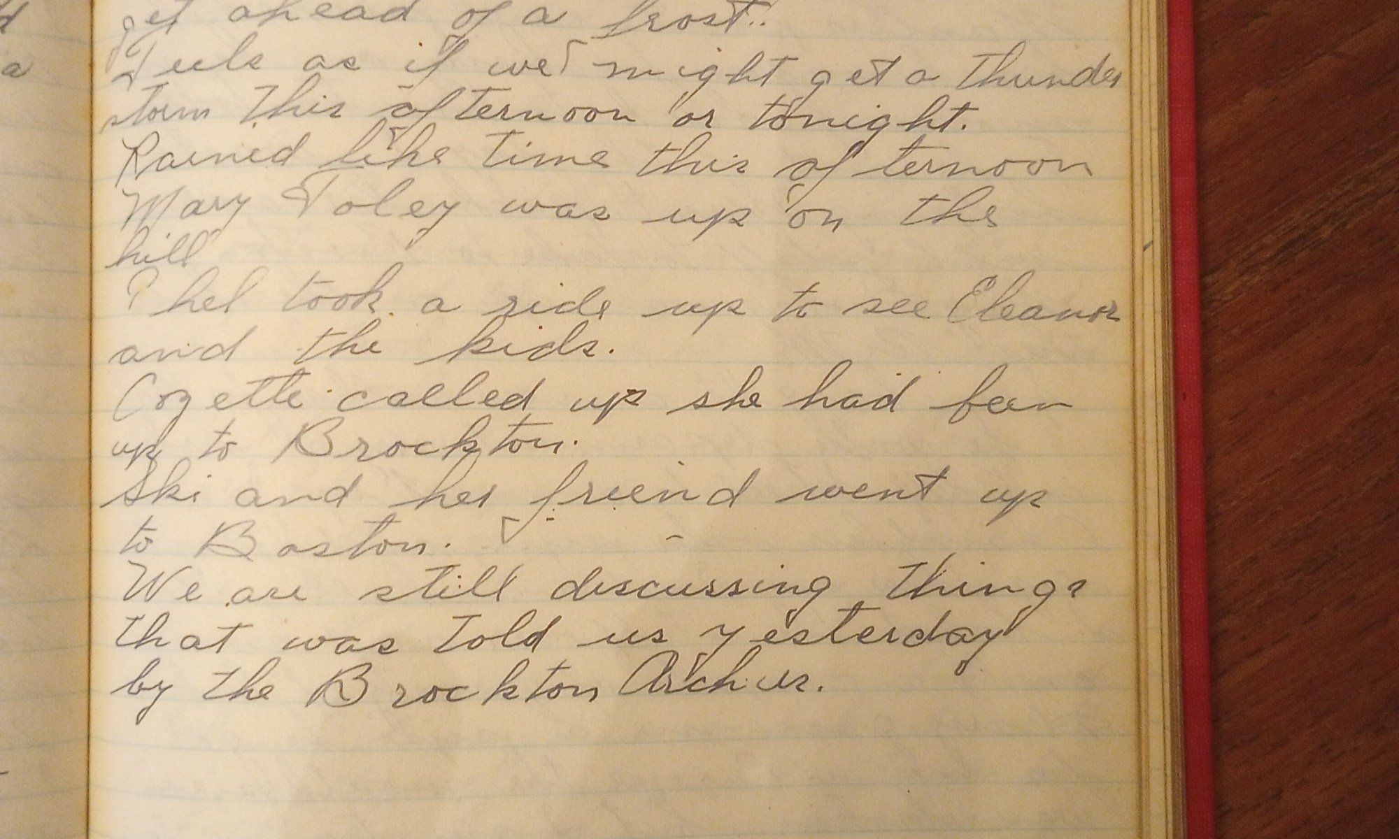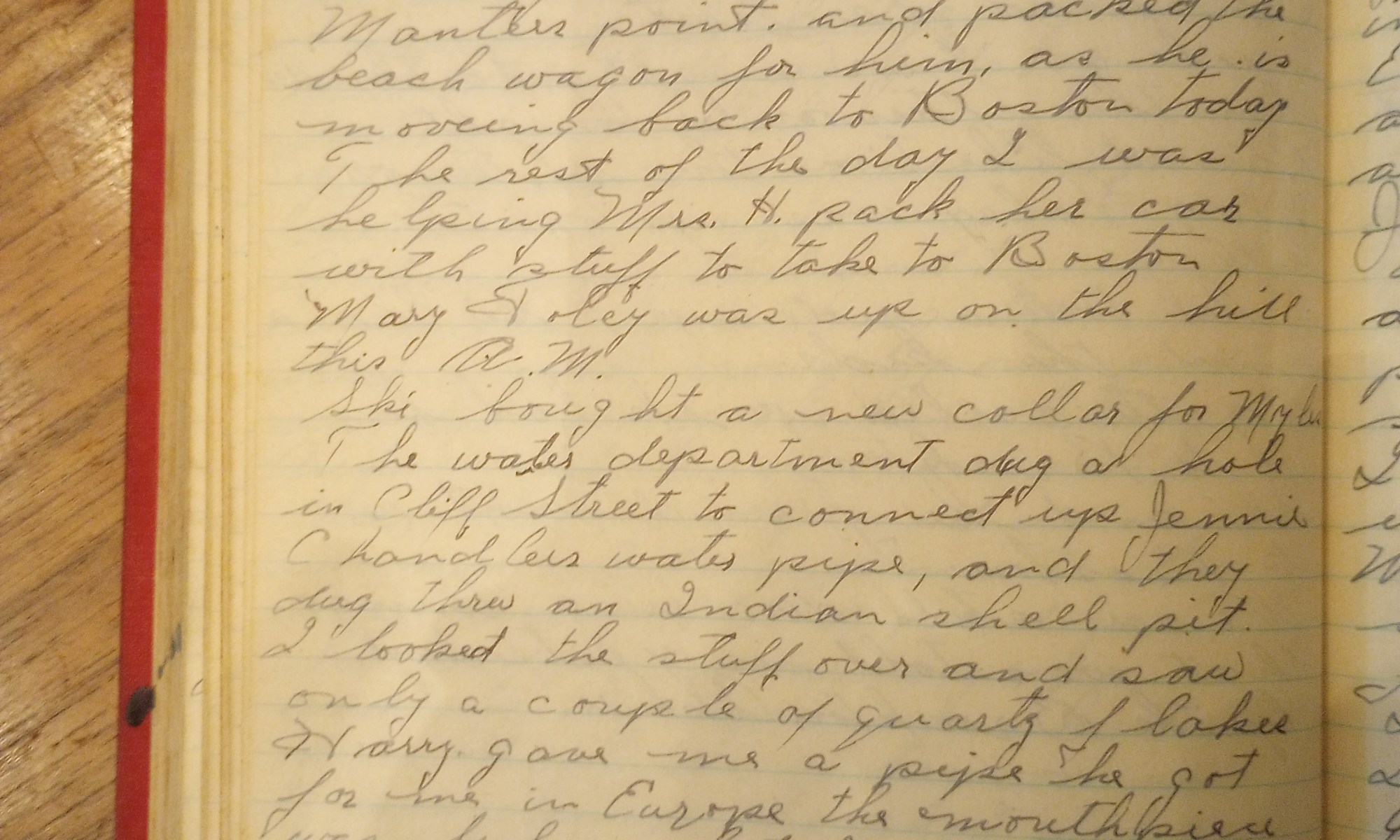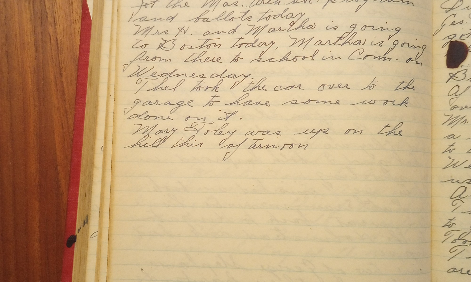 266th day- 99 days follow Mild and partly cloudy. Got the Mass. Arch. Soc. program and ballots today. Mrs. H. and Martha are going to Boston today. Martha’s going from there to school in Conn. on Wednesday. Thel took the car over to the garage to have some work done on it. Mary Foley was …