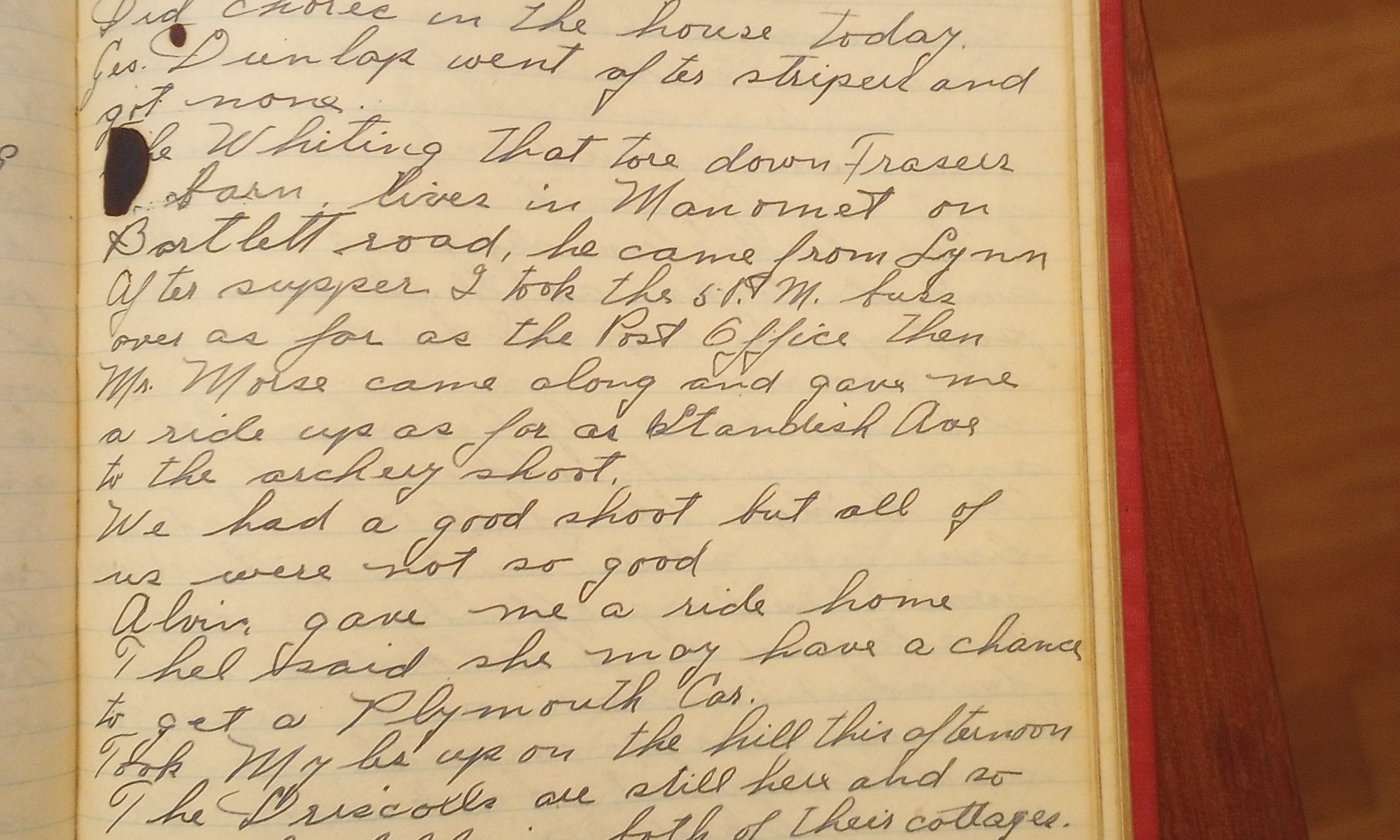 267th day- 98 days follow Cloudy and warm. Did chores in the house today. Geo. Dunlap went after stripers and got none. The Whiting that tore down Fraser’s barn lives in Manomet on Bartlett Road. He came from Lynn. After supper I took the 6 P.M. bus over as far as the Post Office. Then …
