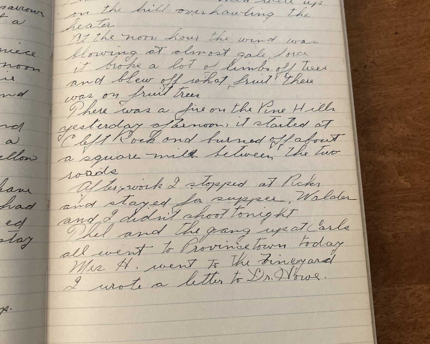 241st day- 124 days follow Cloudy. Wind. Showers The White Fuel men were up on the hill overhauling the heater. At the noon hour the wind was blowing at almost gale force. It broke a lot of limbs off trees and blew off what fruit there was on the fruit trees. There was a fire …