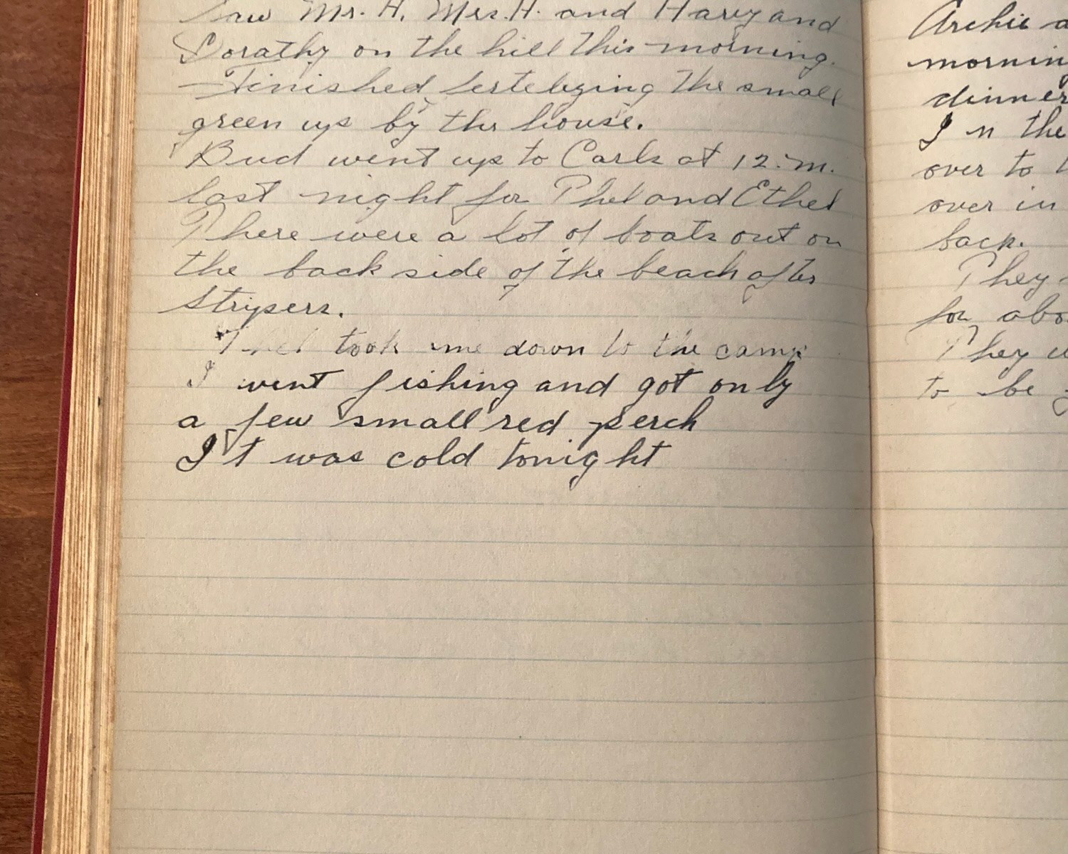 246th day- 119 days follow Partly Cloudy A.M. Fair + cool P.M. Saw Mr. H., Mrs. H., and Harry and Dorothy on the hill this morning. Finished fertilizing the small green up by the house. Bud went up to Carl’s at 12 M. last night for Thel and Ethel. There were a lot of boats …