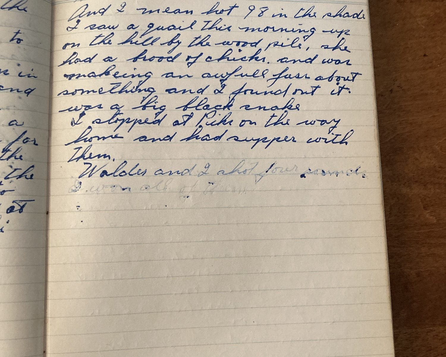 221st day- 144 days follow Fair + Hot And I mean hot. 98 in the shade. I saw a quail this morning up on the hill by the wood pile. She had a brood of chicks, and was making an awful fuss about something and I found out it was a big black snake. I …