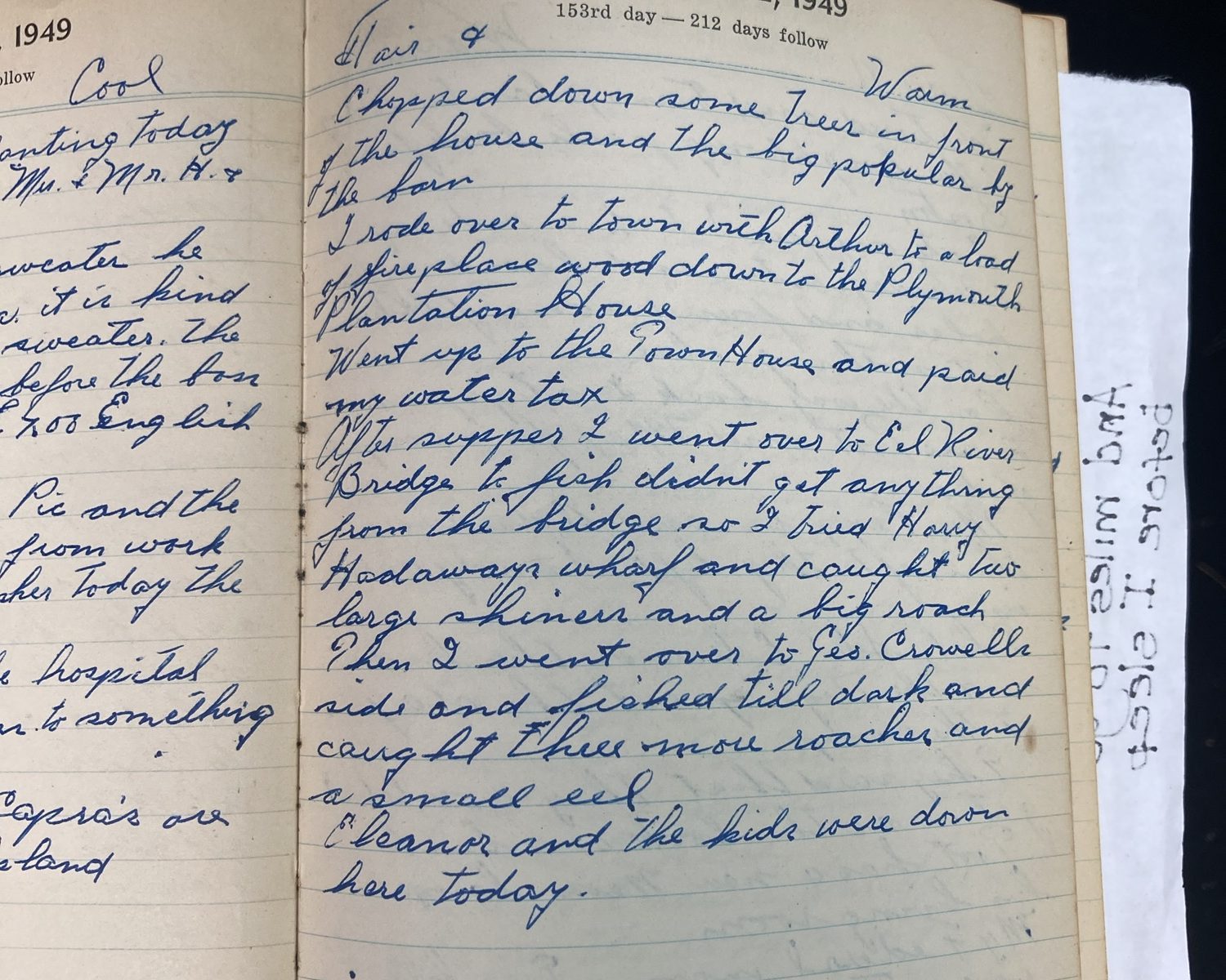 153rd day- 212 days follow Fair + Warm Chopped down some trees in front of the house and the big poplar by the barn. I rode over to town with Arthur to [deliver] a load of fireplace wood down to the Plymouth Plantation House. Went up to the Town House and paid my water tax. …