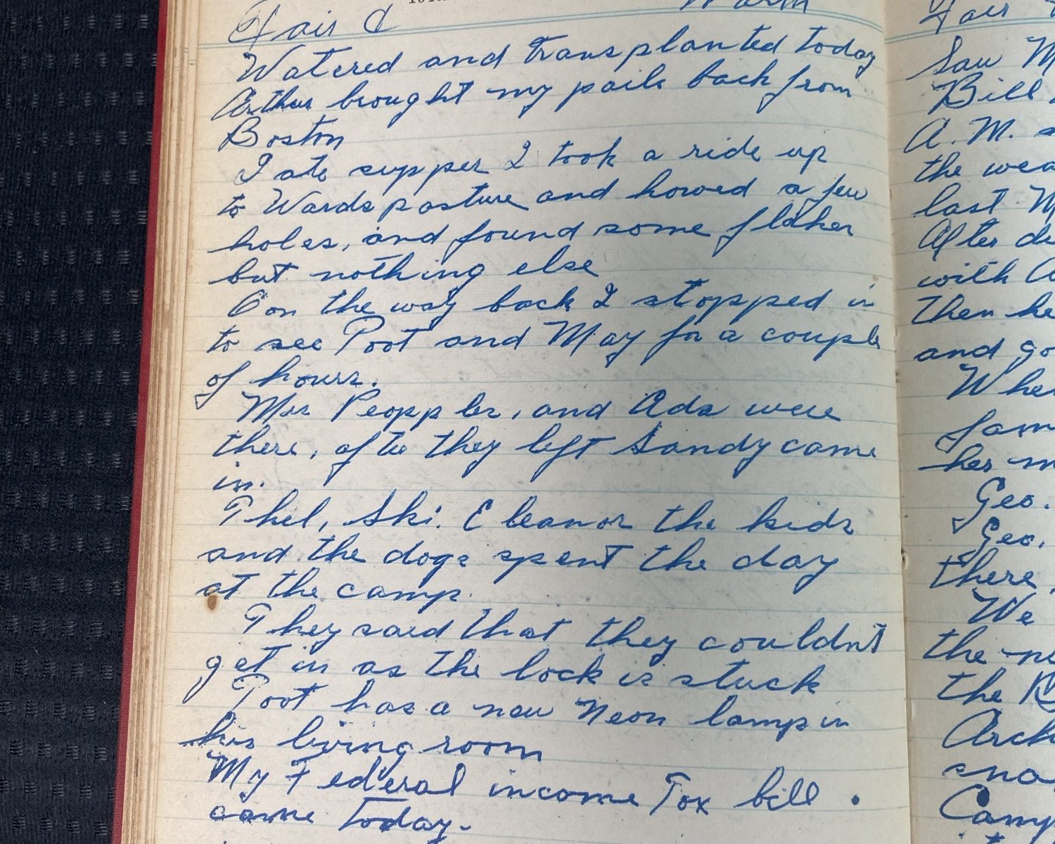 152nd day- 213 days follow Foggy + Cool Did some transplanting today. This morning I saw Mr. and Mrs. H. + Harry. Mr. H. gave me a sweater he brought from Bermuda. It is kind of gaudy but a swell sweater. The price tag I saw on it before the boss gave it to me …