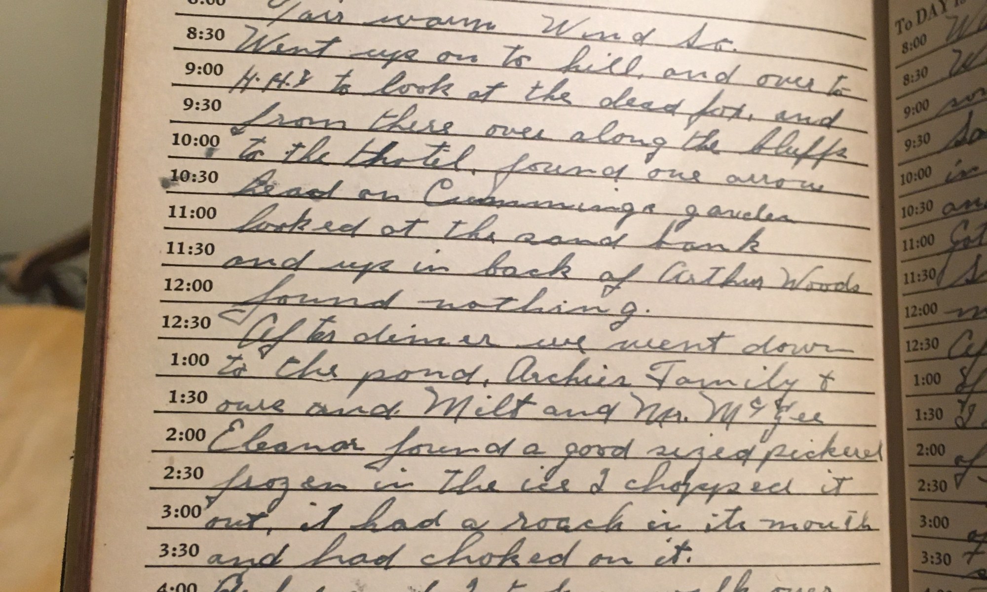 ToDay is the Birthday of Fair, warm, Wind So. Went up on the hill an over to HH’s to look at the dead fox and from there over along the bluffs to the hotel, found one arrowhead on Cummings garden, looked at the sand bank and up in back of Arthur Woods, found nothing. After …