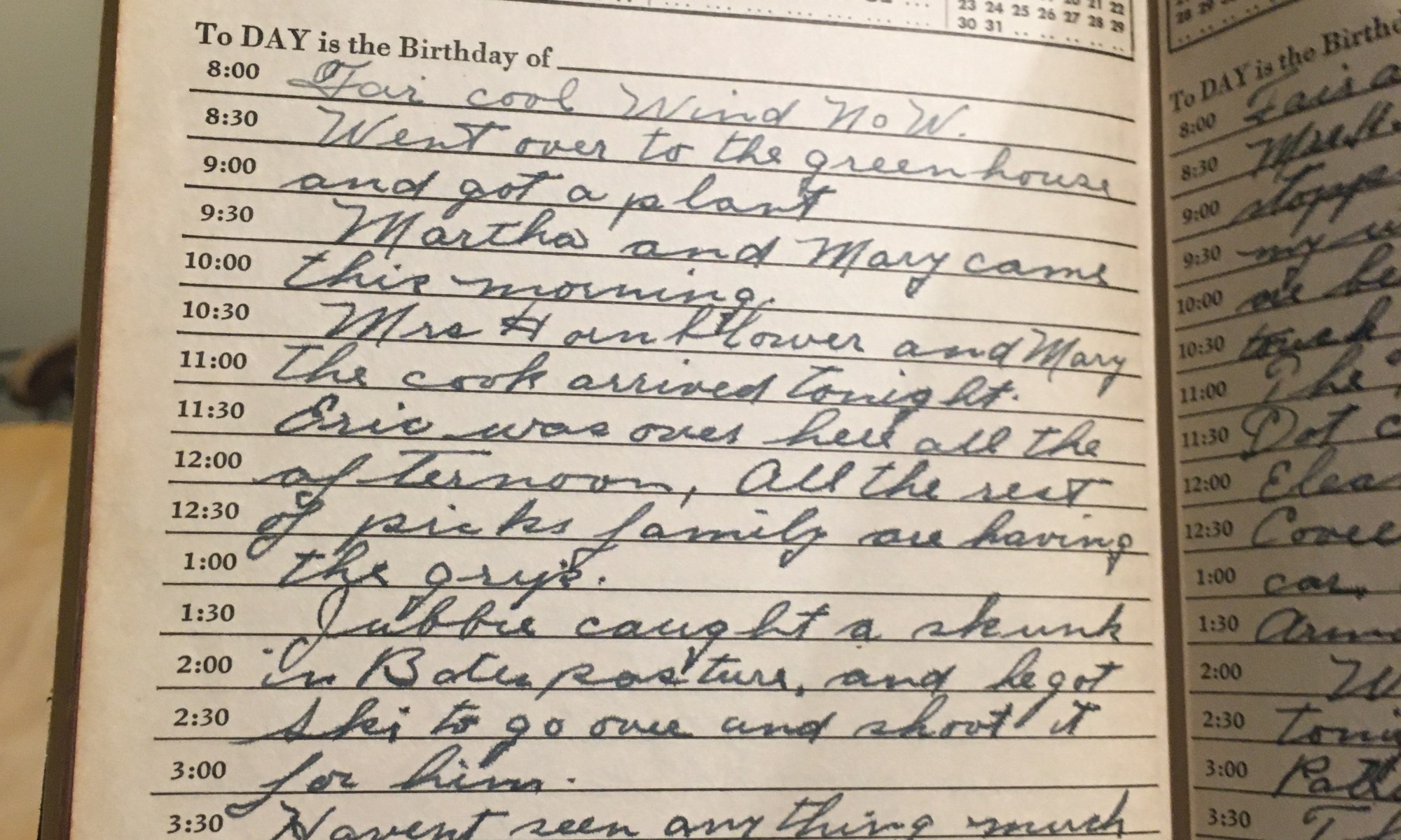 ToDay is the Birthday of Fair and cool wind No W. Went over to the greenhouses and got a plant. Martha and Mary came this morning. Mrs. Hornblower and Mary the cook arrived tonight. Eric was over here all the afternoon. All the rest of Pick’s family are having the gripe. Jubbie caught a skunk …