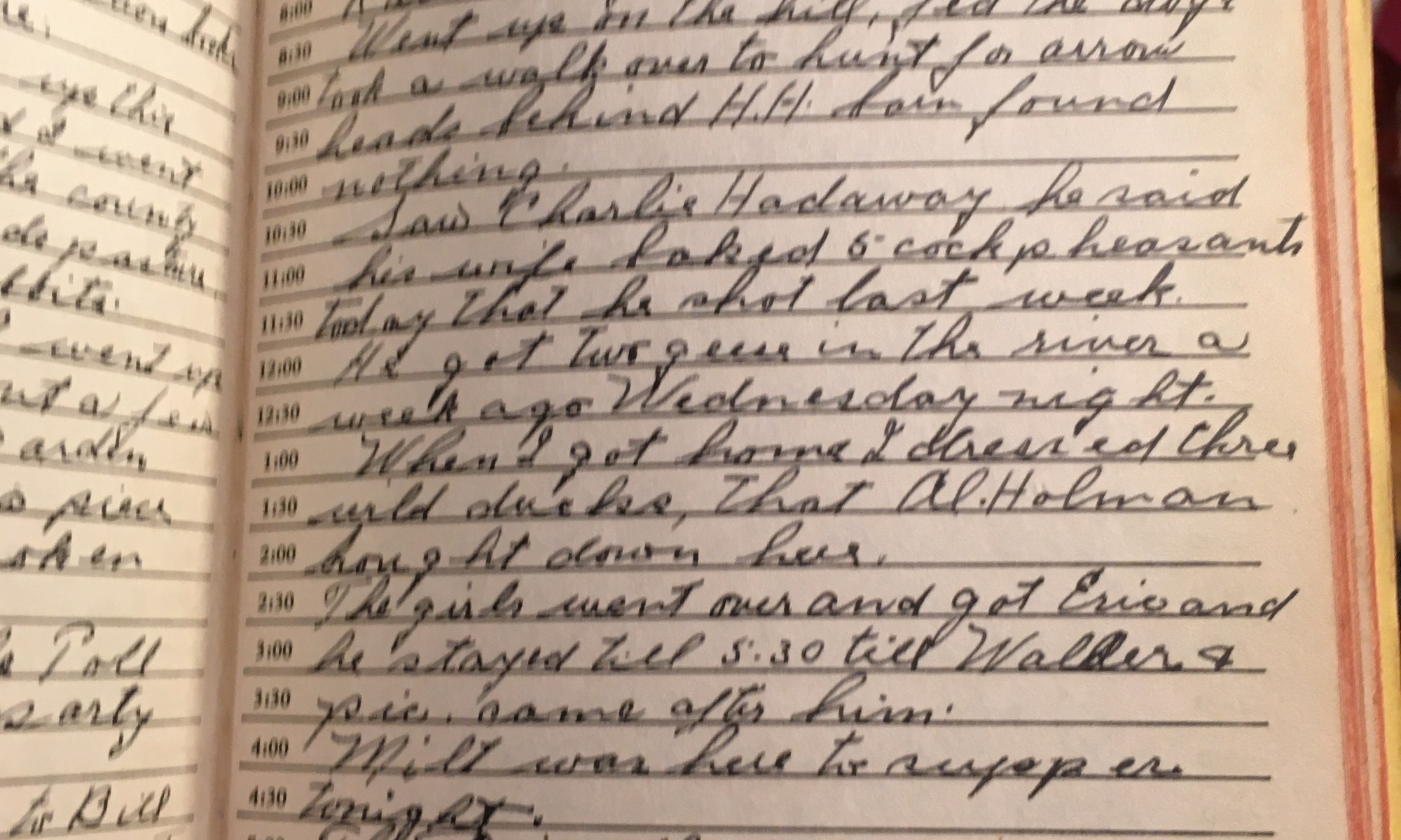 ToDay is the Birthday of Rain today, wind No. Went up on the hill, fed the dogs, took a walk over to hunt for arrowheads behind H.H. barn, found nothing. Saw Charlie Hadaway, he said his wife baked 5 cock pheasants today that he shot last week. He got two geese in the river a …