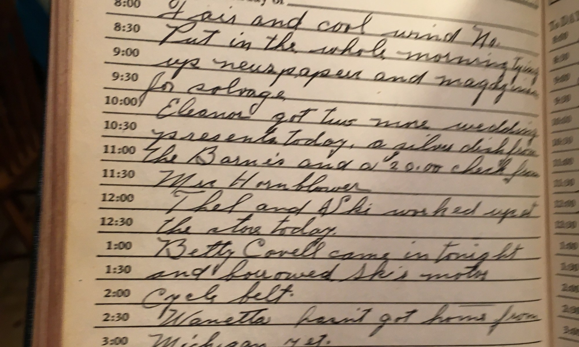 ToDay is the Birthday of Fair and cool wind No. Put in the whole morning tying up newspaper and magazines for salvage. Eleanor got two more wedding presents today, a silver dish from the Barne’s and a $20.00 check from Mrs. Hornblower. Thel and Ski worked up at the store today. Betty Covell came in …