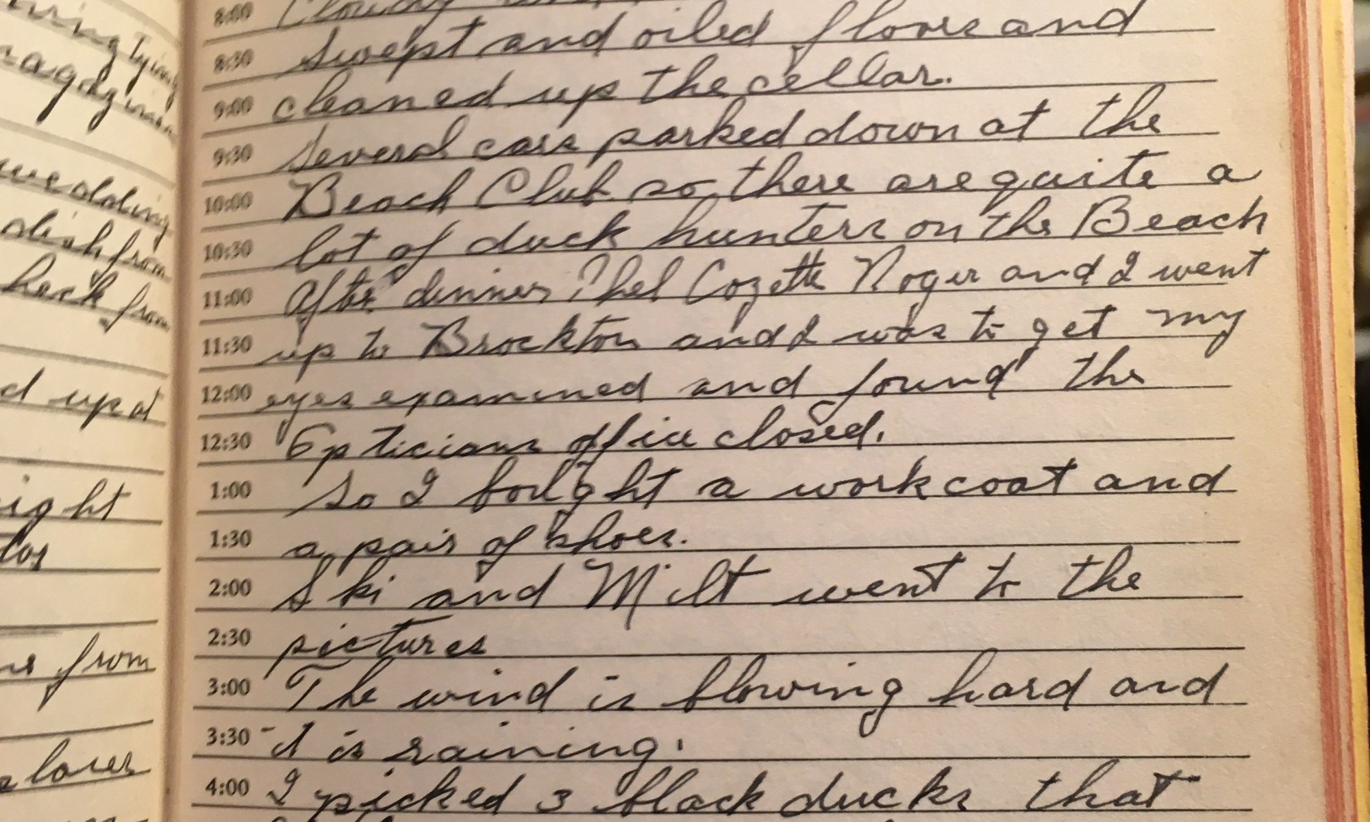 ToDay is the Birthday of $7.00 from Thel Cloudy and showers Wind N.E. Swept and oiled floors and cleaned up the cellar. Several cars parked down at the Beach Club so there are quite a lot of duck hunters on the Beach. After dinner Thel, Cozette, Roger, and I went up to Brockton and I …