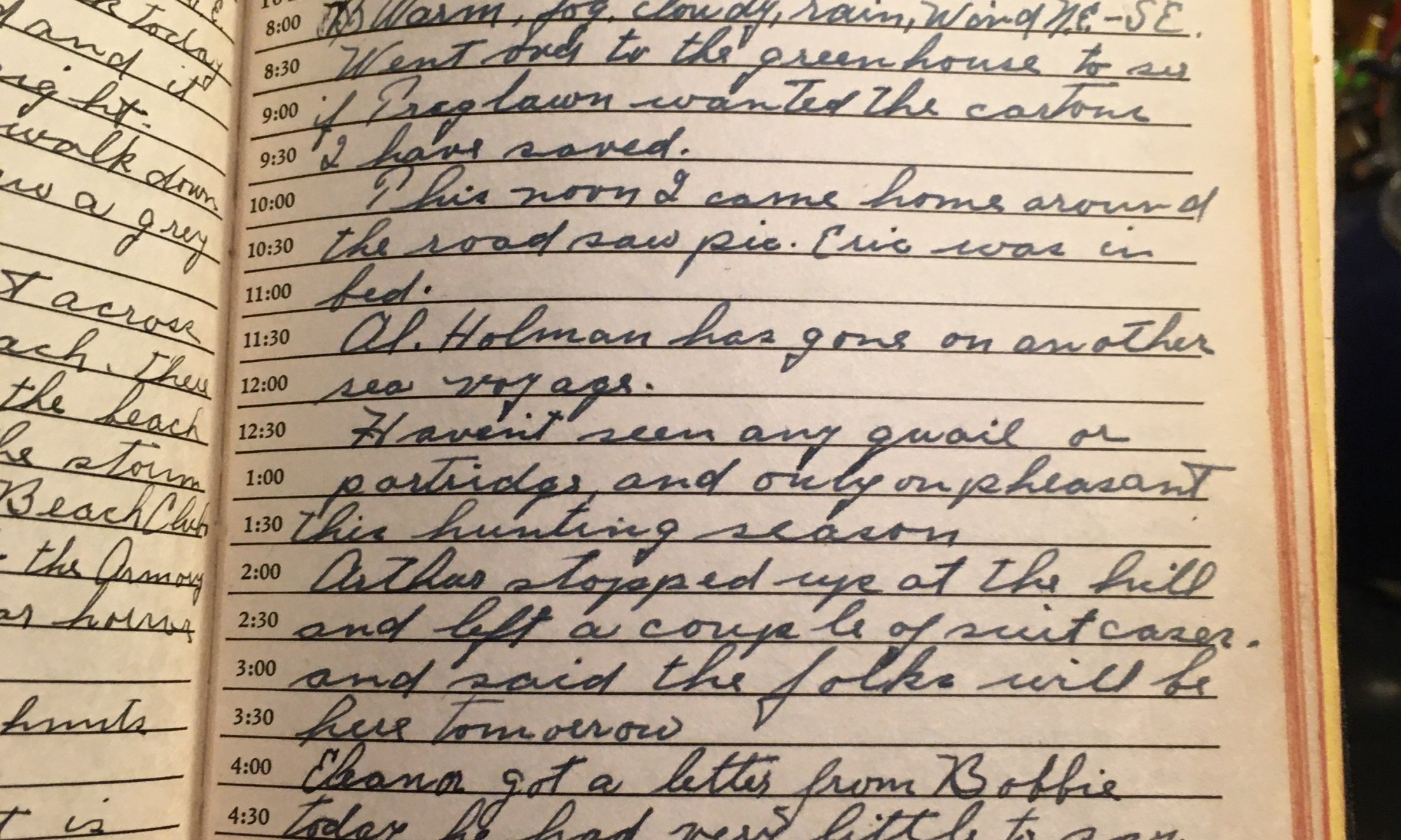 ToDay is the Birthday of Warm, fog, cloudy, rain, wind NE-SE. Went over to the greenhouse to see if Treglawn wanted the cartons I have saved. This noon I came home around the road saw Pic. Eric was in bed. Al Holman has gone on another sea voyage. Haven’t seen any quail or partridge, and …