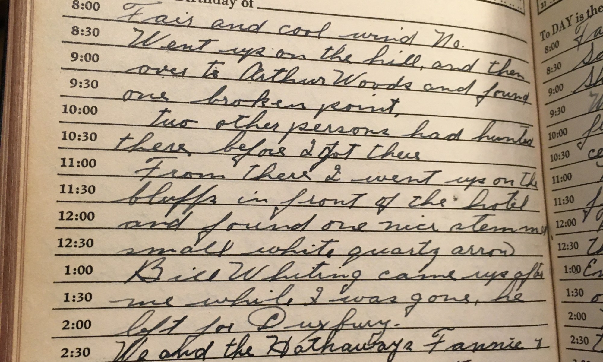 ToDay is the Birthday of Fair and cool, wind No. Went up on the hill, and then over to Arthur Woods and found one broken point. Two other persons had hunted there before I got there. From there I went up on the bluffs in front of the hotel and found one nice stemmed small …