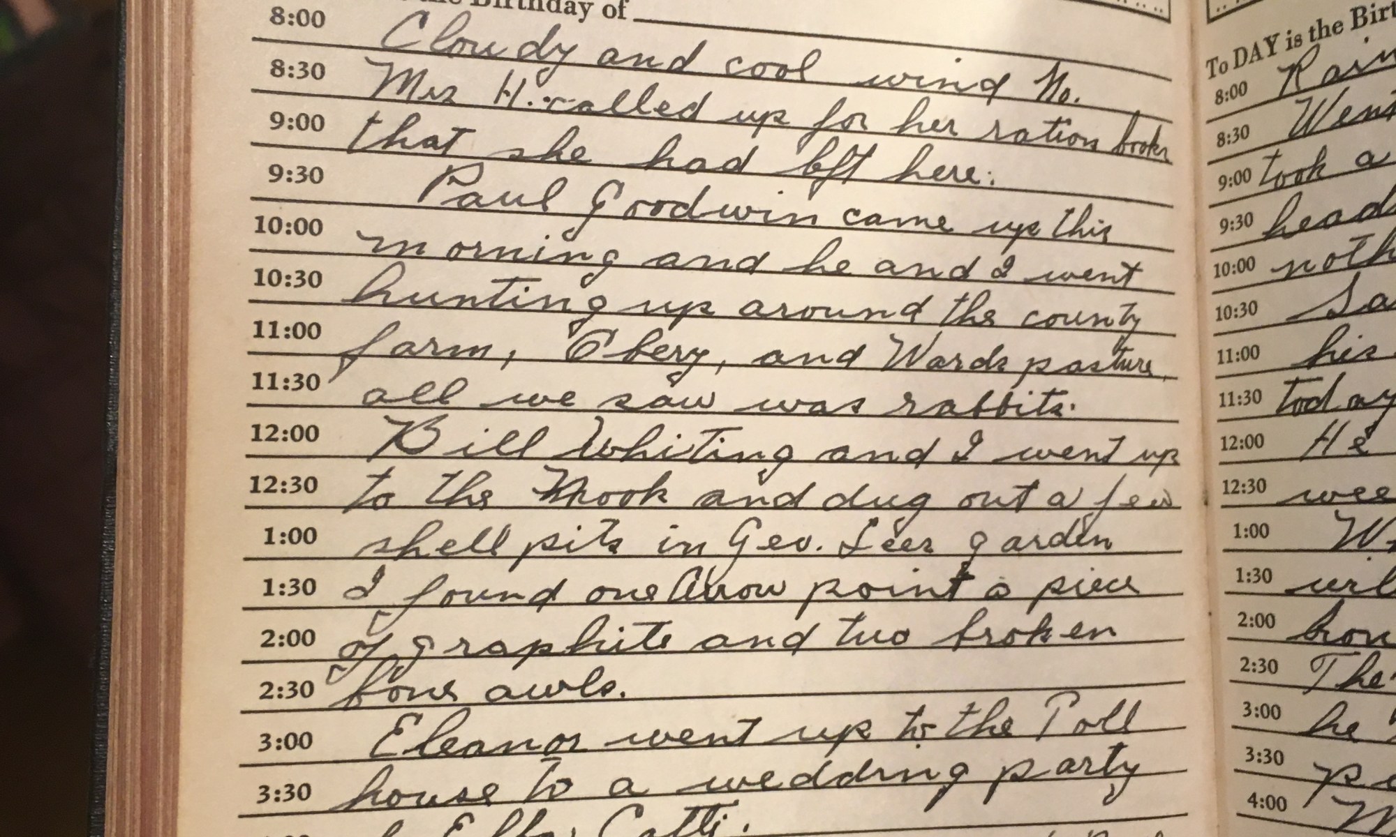 ToDay is the Birthday of Cloudy and cool, wind No. Mrs. H called up for her ration books that she had left here. Paul Goodwin came up this morning and he and I went hunting up around the country farm, Obery, and Ward’s pasture. All we saw was rabbits. Bill Whiting and I went up …