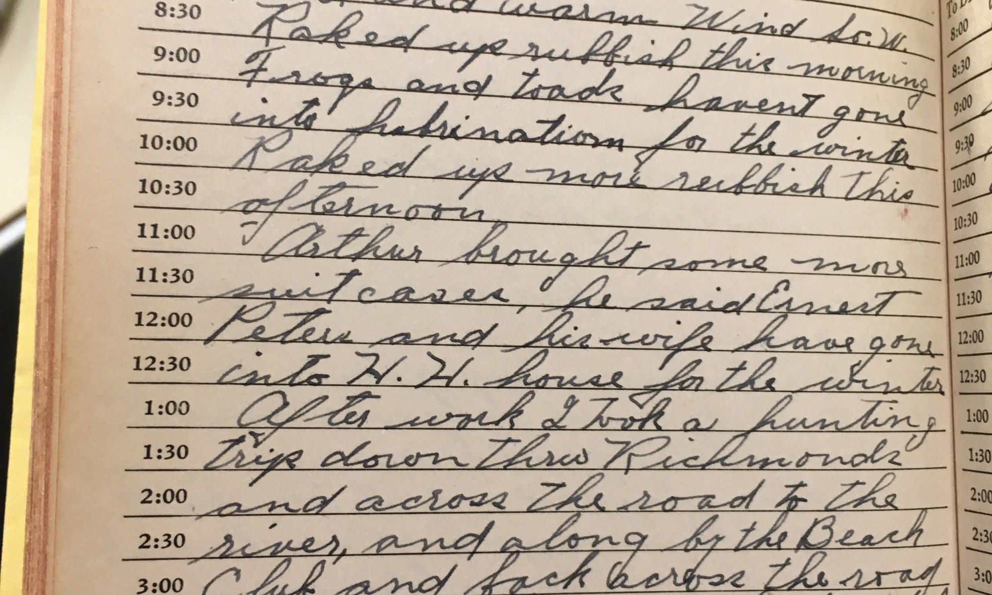 ToDay is the Birthday of Fair and warm, wind So.W. Raked up rubbish this morning. Frogs and toads haven’t gone into hibernation for the winter. Raked up more rubbish this afternoon. Arthur brought some more suitcases, he said Ernest, Peter, and his wife have gone into H.H. house for the winter. After work, I took …