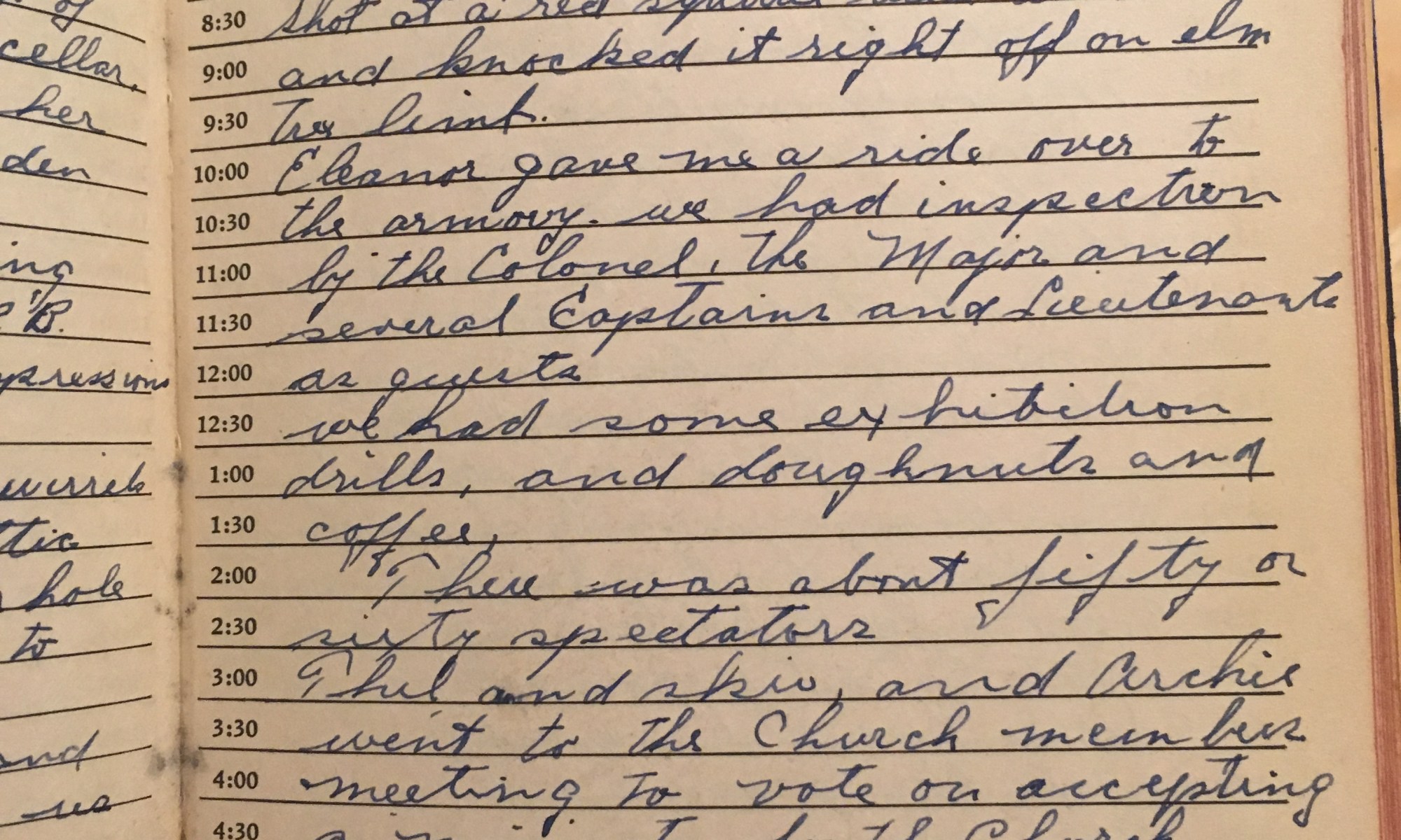 ToDay is the Birthday of Rian today, wind No. East. Shot at a red squirrel with an arrow and knocked it right off an elm tree limb. Eleanor gave me a ride over to the Armory. We had inspection by the Colonel, the Major, and several Captains and Lieutenants as guests. We had some exhibition …
