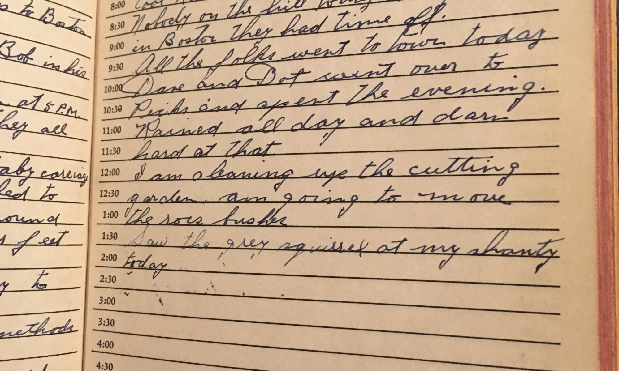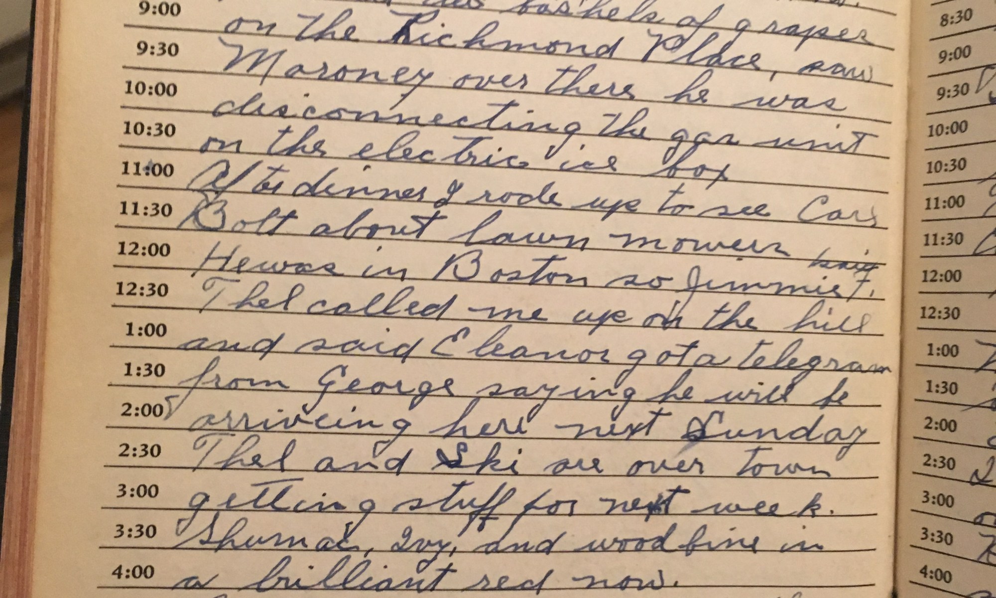 ToDay is the Birthday of Foggy, clearing off fine, Wind No. Picked two bushels of grapes on the Richmond place, saw Maroney over there, he was disconnecting the gas unit on the electric ice box. After dinner I rode up to see Carl Bolt about lawn mowers. He was in Boston so Jimmie F… Thel …