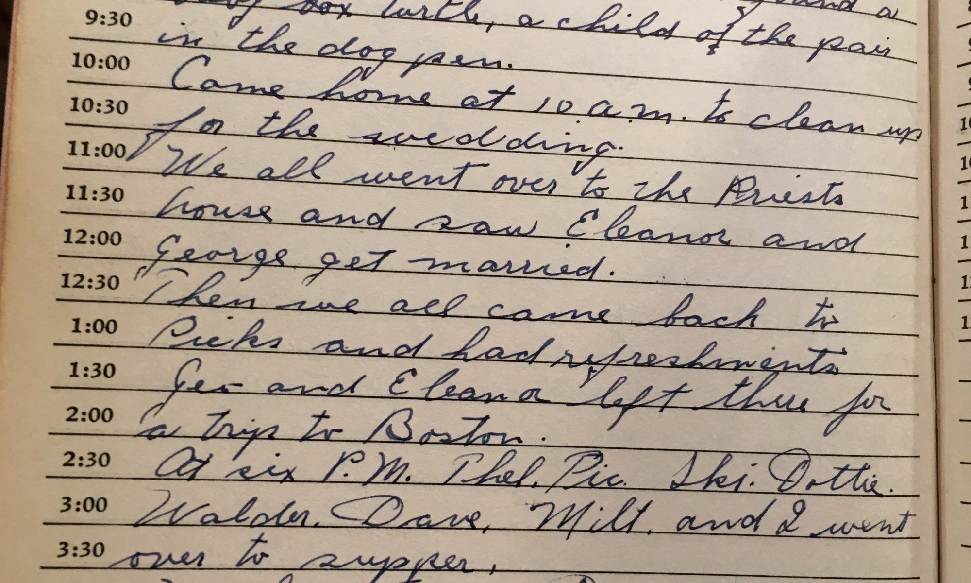 ToDay is the Birthday of Eleanor and George Married Rain hard today. Wind NE. Went up on the hill and found a baby box turtle, a child of the pair in the dog pen. Came home at 10 am. to clean up for the wedding. We all went over to the Priest’s house and saw …