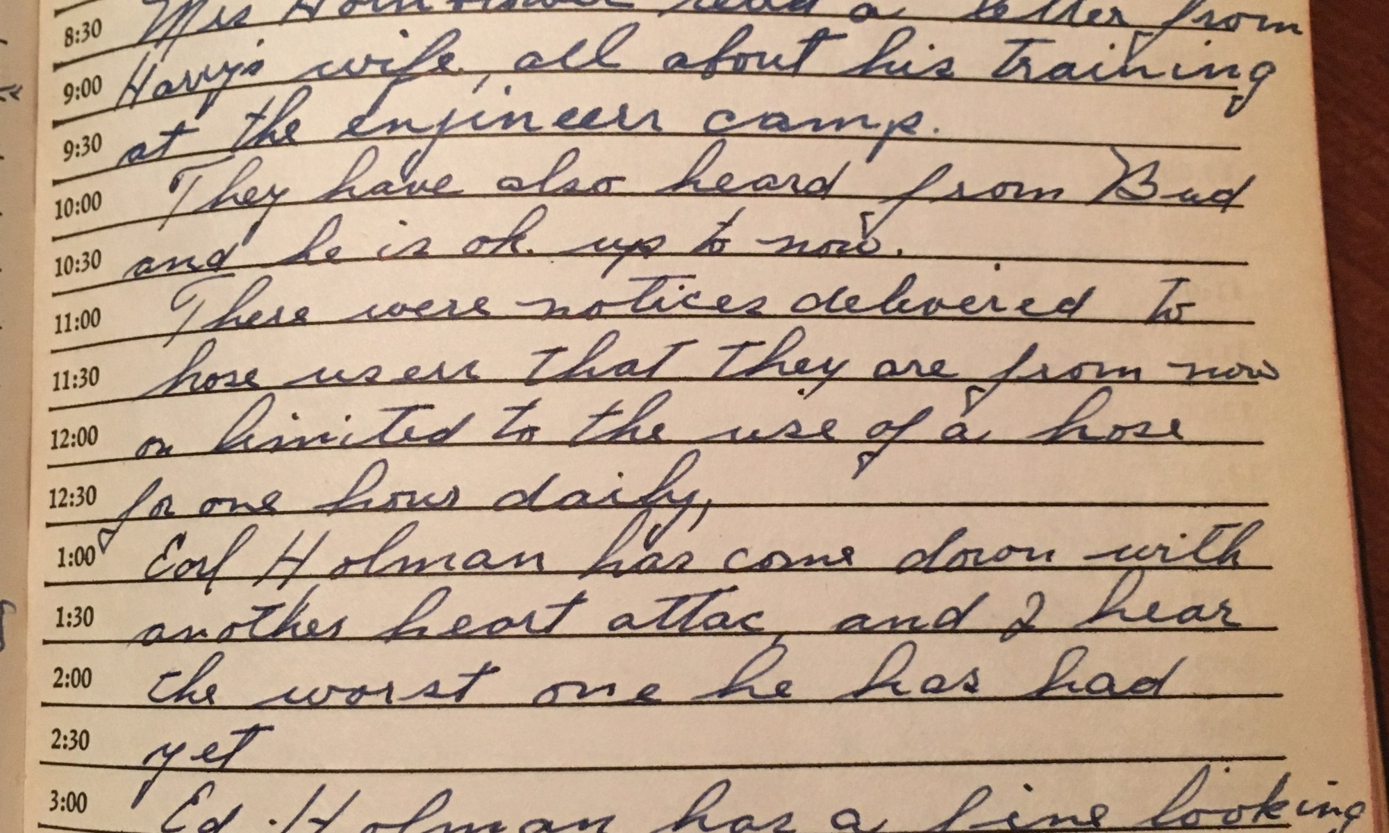 Today is the birthday of Fair and hot today wind So. Mrs. Hornblower read a letter from Harry’s wife, all about his training at the engineers camp. They have also heard from Bud and he is ok up to now. There were notices delivered to hose users that they are from now on limited to …
