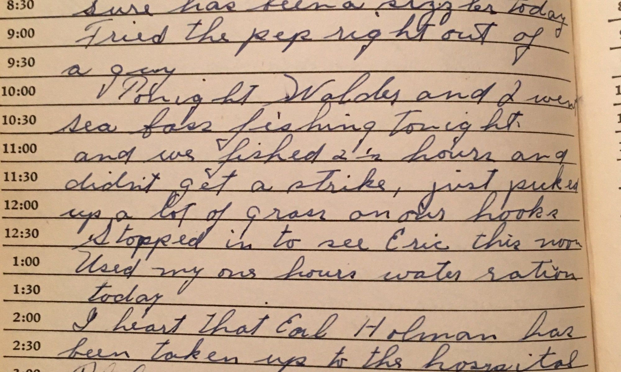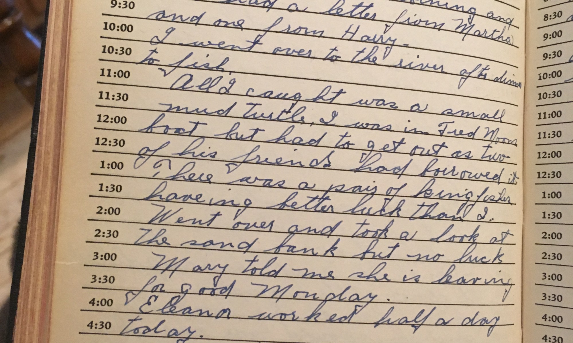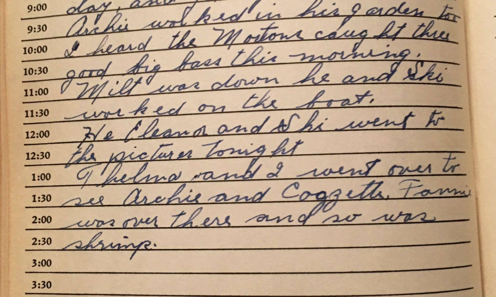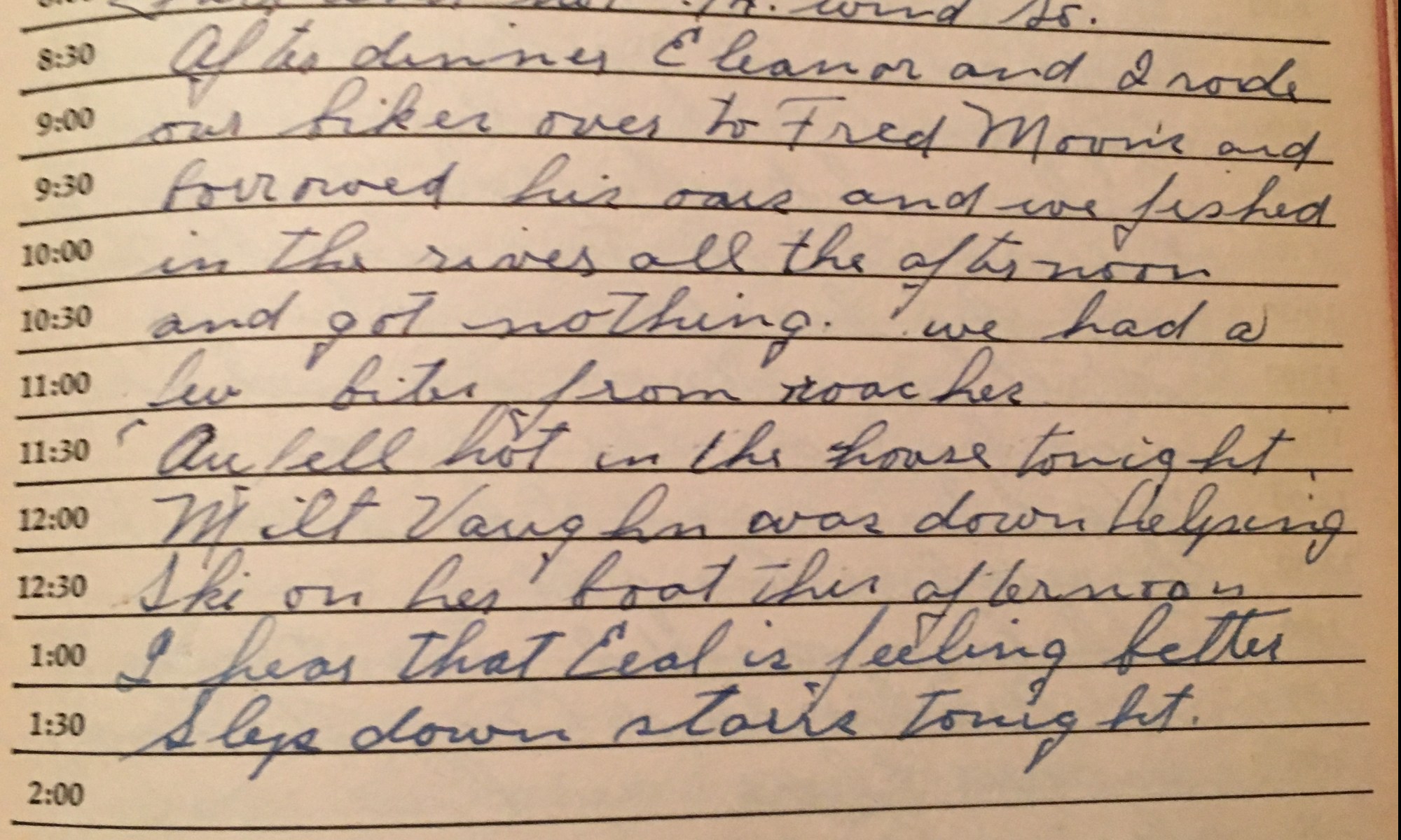 Today is the birthday of Fair and hot. 94. Wind So. After dinner Eleanor and I rode our bikes over to Fred Moon’s and borrowed his oars and we fished in the river all afternoon and got nothing. We had a few bites from roaches. Awful hot in the house tonight. Milt Vaughn was down …