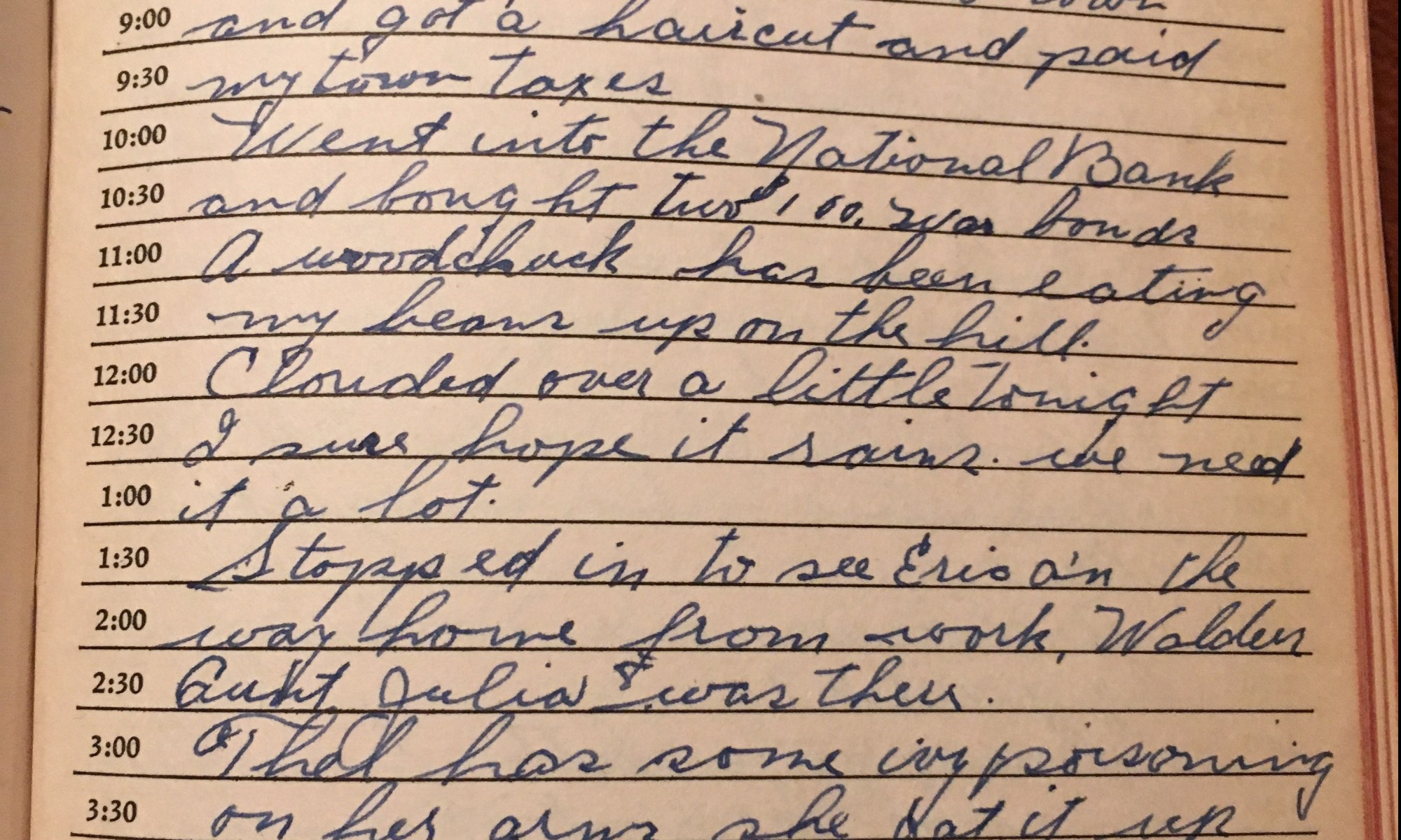 Today is the birthday of Paid $81.95 in taxes. Fair and hot wind So. Rode my wheel over to town and got a haircut and pay my town taxes. Went into the National Bank and bought two $100 war bonds. A woodchuck has been eating my beans up on the hill. Clouded over a little …