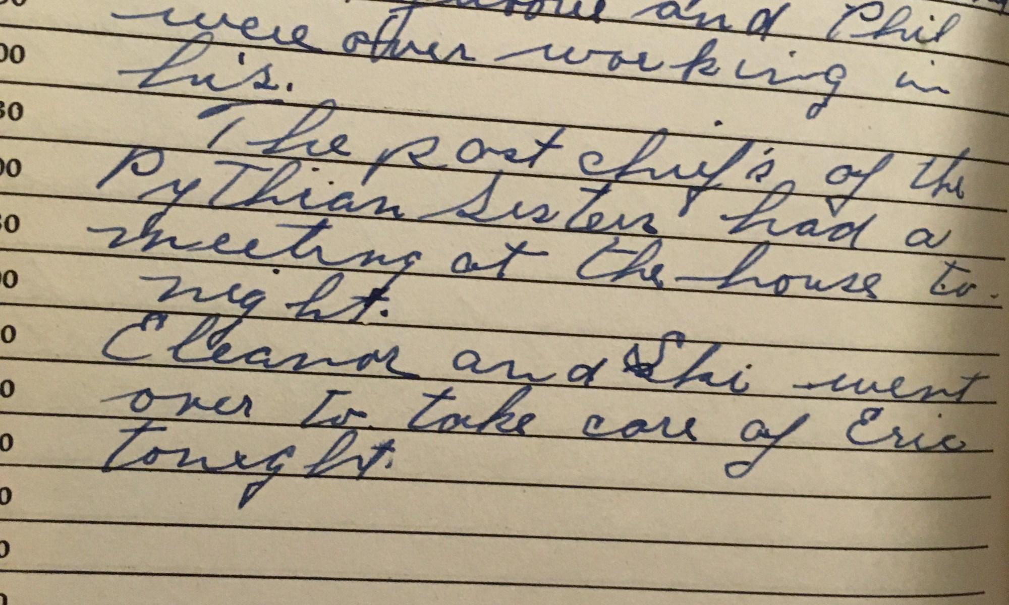 ToDay is the Birthday of Hot today, wind So. Worked in the garden, and Archie, Jubbie [?] and Phil were over working in Lu's. The post chief of the Pythian Sisters had a meeting at the house tonight. Eleanor and Ski went over to take care of Eric tonight. “Tale bearers are just as bad …