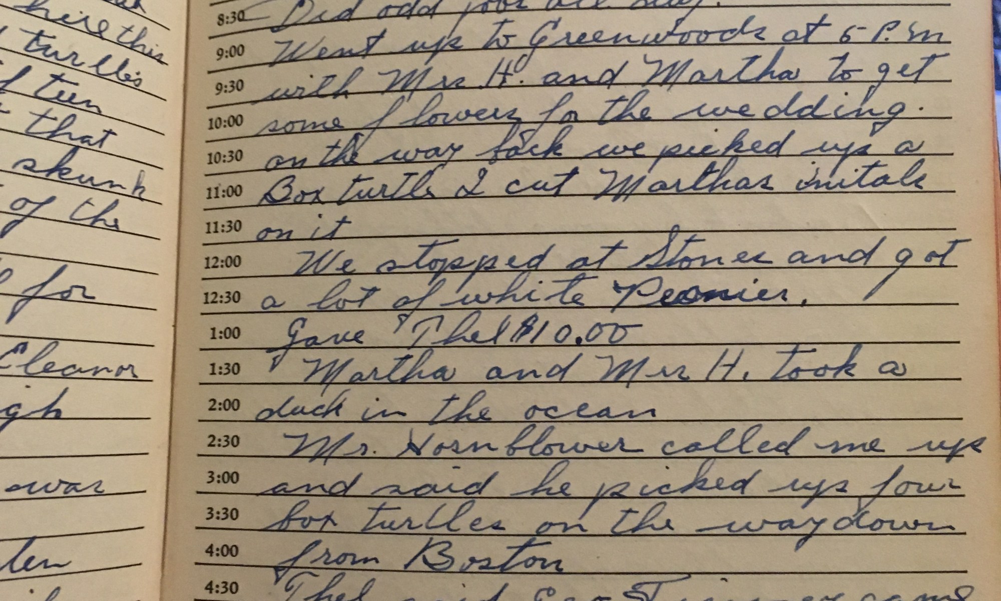 Today is the birthday of Thel paid me $15 dollars. Fair and warm wind So. W. Did odd jobs all day. Went up to Greenwoods at 5PM with Mrs. H. And Martha to get some flowers for the wedding. On the way back we picked up a Box turtle and I cut Martha’s initials on …