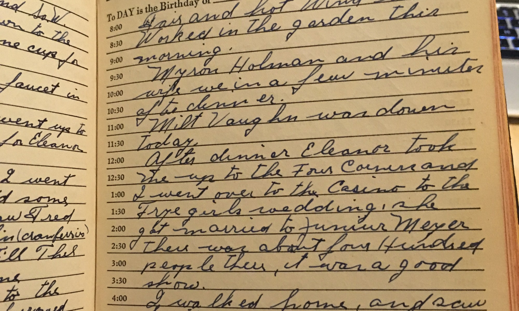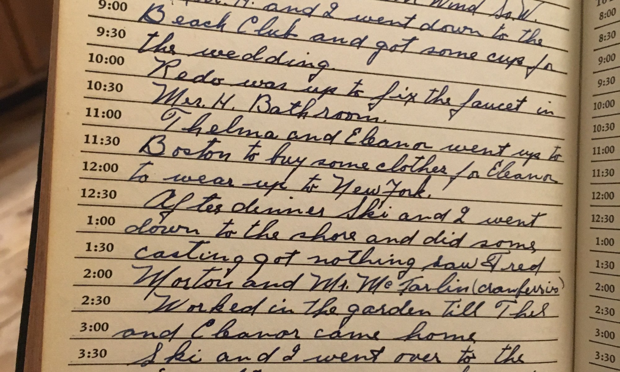 Today is the birthday of Fair and hot wind So. W. Mrs. H and I went down to the Beach Club and got some cups for the wedding. Redo was up to fix the faucet in Mrs. H’s bathroom. Thelma and Eleanor went up to Boston to buy some clothes for Eleanor to wear up …