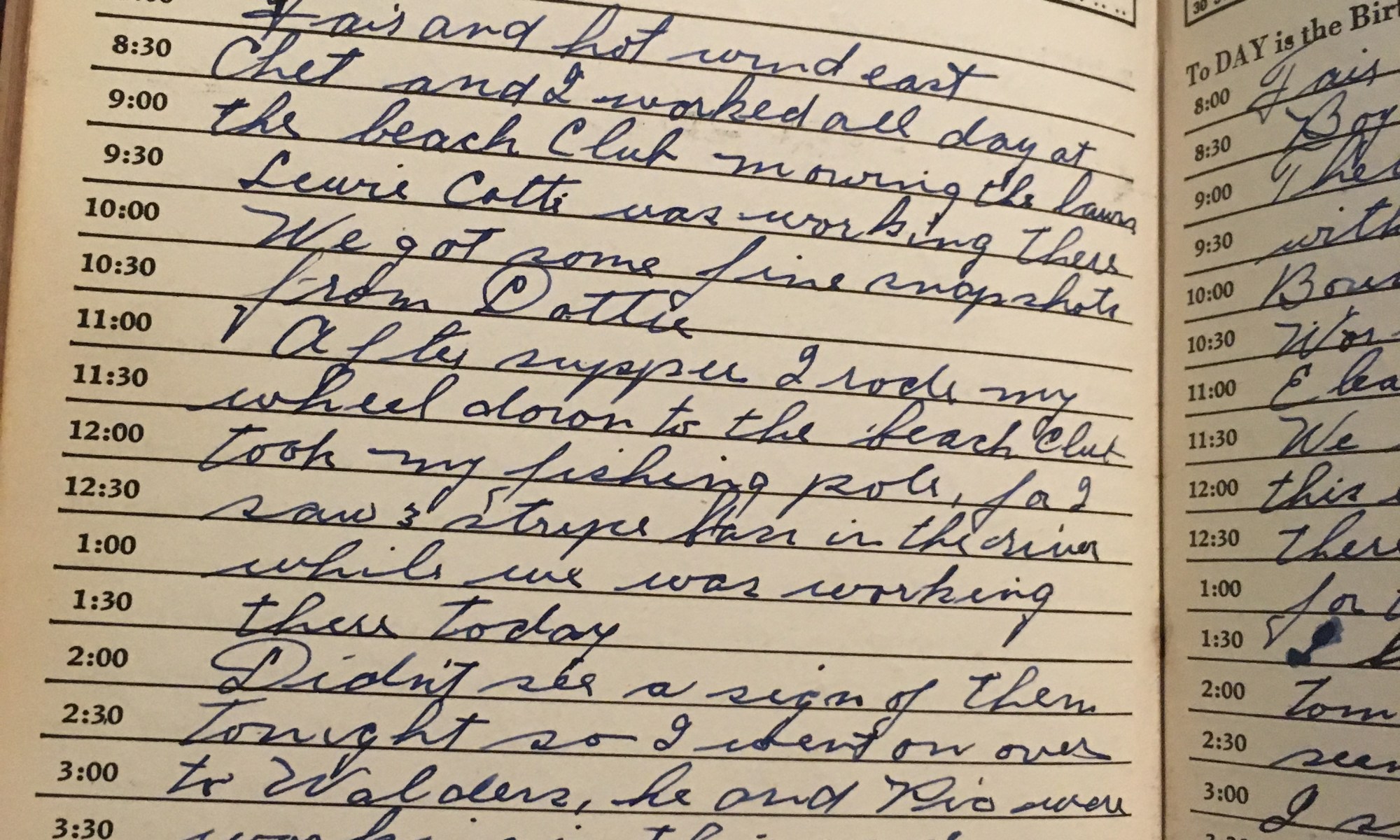 Today is the birthday of Fair and hot wind east Chet and I worked all day at the beach club mowing the lawn. Lewie Cotti was working there. We got some fine snapshots from Dottie. After supper I rode my wheel down to the beach club took my fishing pole, for I saw 3 striped …