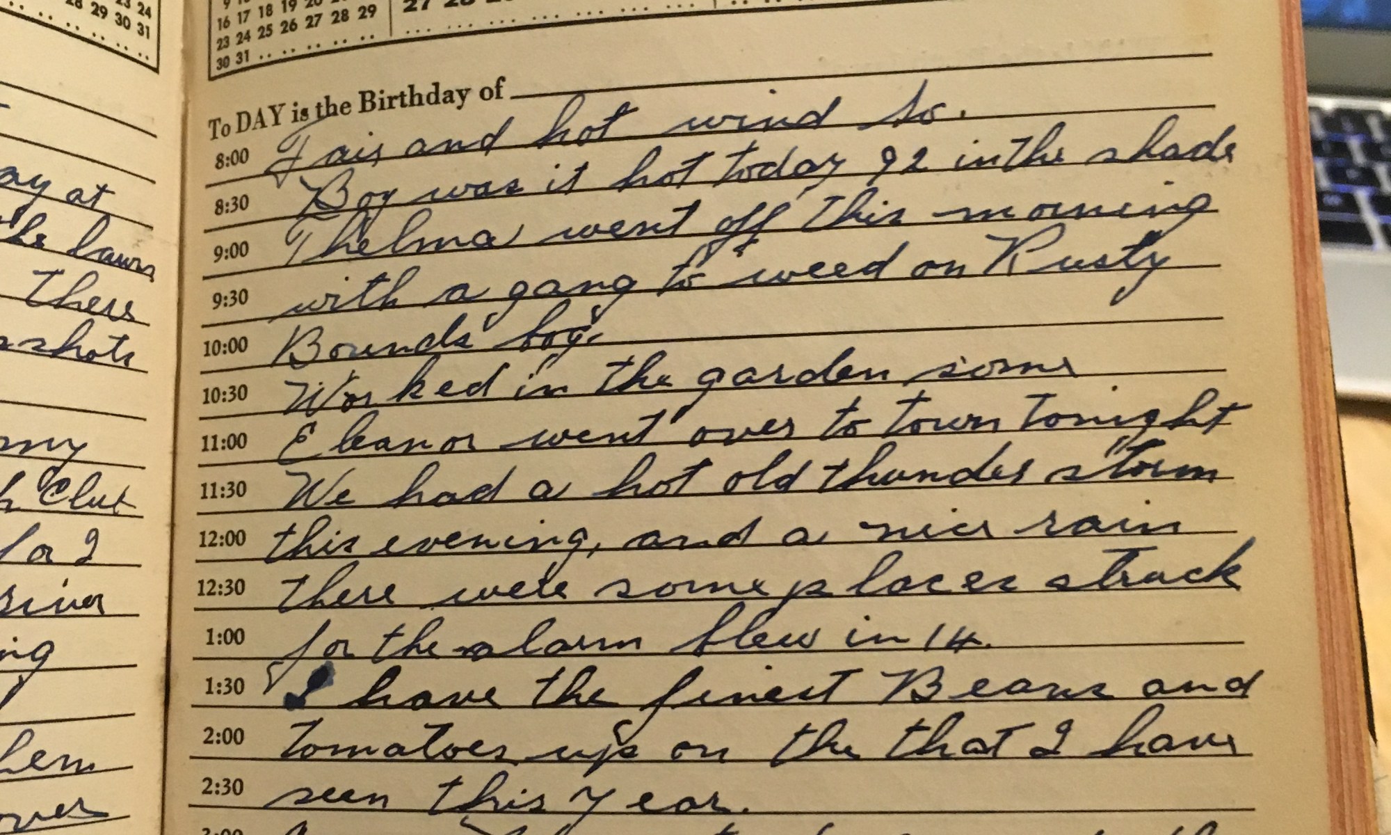 Today is the birthday of Fair and hot wind So. Boy was it hot today 92 in the shade. Thelma went off this morning with a gang to weed on Rusty Round’s bog. Worked in the garden some. Eleanor went over to town tonight. We had a hot old thunder storm this evening, and a …