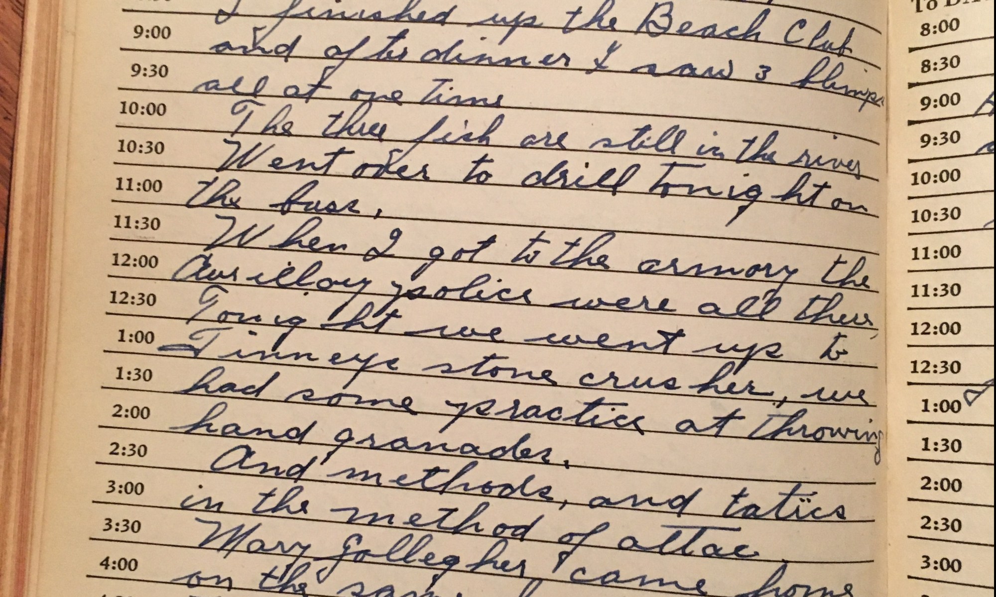 Today is the birthday of Thel paid me $9.00. Fair and cool wind East. I finished up the Beach Club and after dinner I saw 3 blimps all at one time. The three fish are still in the river. Went over to drill tonight on the base. When I got to the armory the …