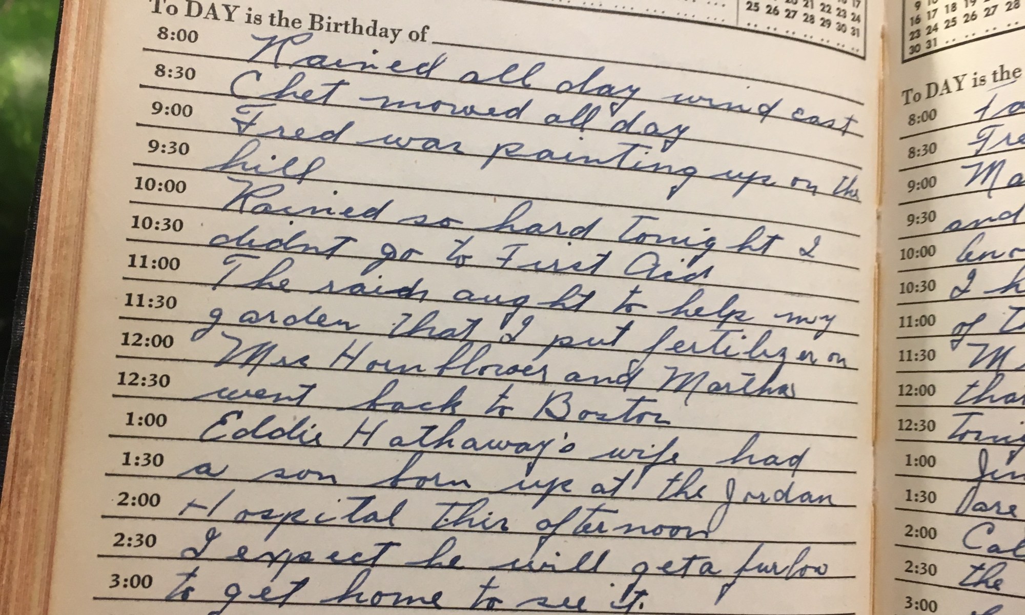 ToDay is the Birthday of Rained all day, wind east. Chet mowed all day. Fred was painting up on the hill. Rained so hard tonight I didn't go to First Aid. The rains ought to help my garden that I put fertilizer on. Mrs. Hornblower and Martha went back to Boston. Eddie Hathaway's wife had …