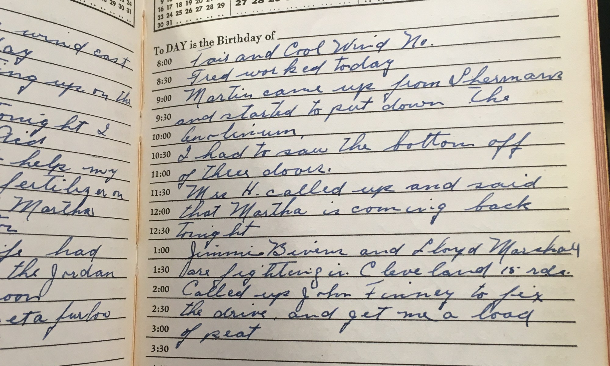 ToDay is the Birthday of Fair and cold, wind No. Fred worked today. Martin came up from Sherman's and started to put down the linoleum. I had to saw the bottom off of their doors. Mrs. H called up and said that Martha is coming back tonight. Jimmie Bivens and Lloyd Marshall are fighting in …