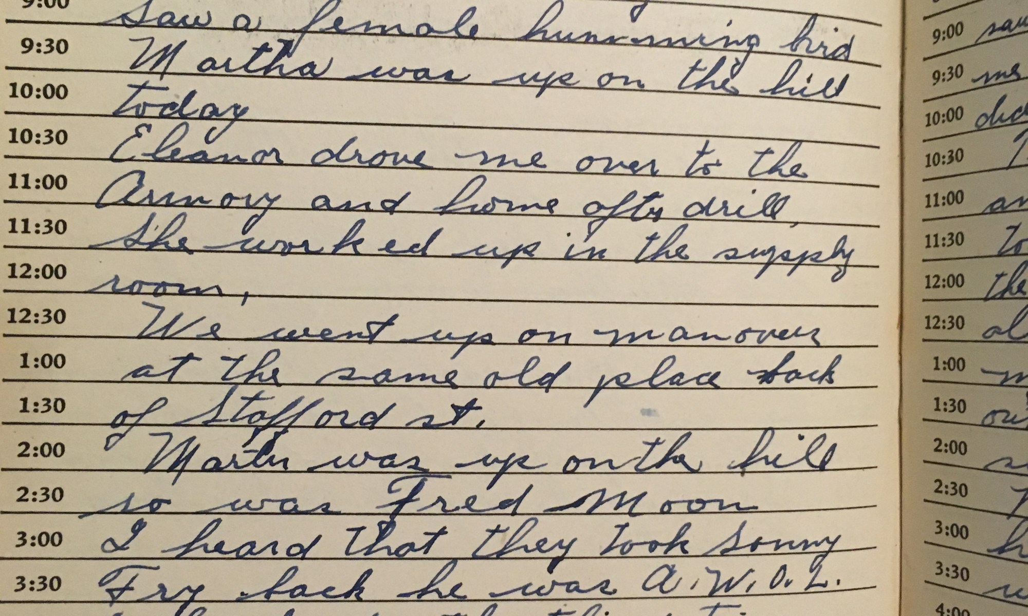 ToDay is the Birthday of Fair and cool wind No. Saw a female hummingbird. Martha was up on the hill today. Eleanor drove me over to the Armory and home after drill. She worked up in the supply room. We went up on maneuvers at the same old place back of Stafford St. Martin was …