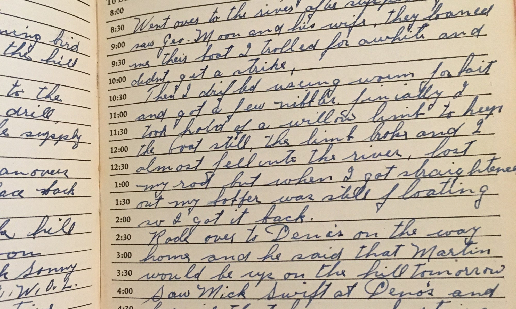 ToDay is the Birthday of Turn to Sept to find this page* One year in State Guard. Went over to the river after supper to fish. Saw Geo. Moon and his wife, they loaned me their boat and I trolled for a while and didn't get a strike. Then I drifted using worm for bait …