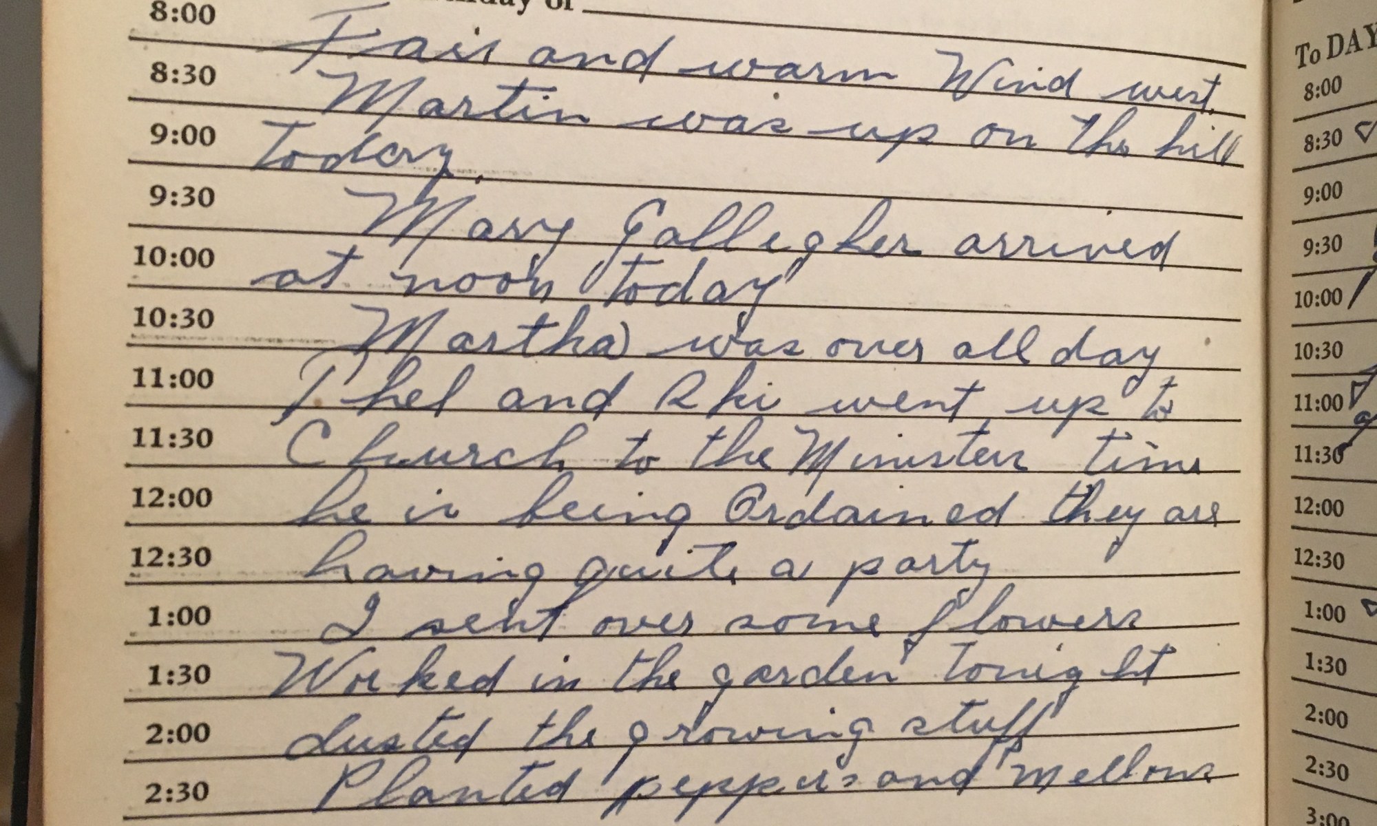 ToDay is the Birthday of Fair and warm, wind west. Martin was up on the hill today. Mary Gallagher arrived at noon today. Martha was over all day. Thel and Ski went up to church to the Minister time, he is being ordained. They are having quite a party. I sent over some flowers. Worked …