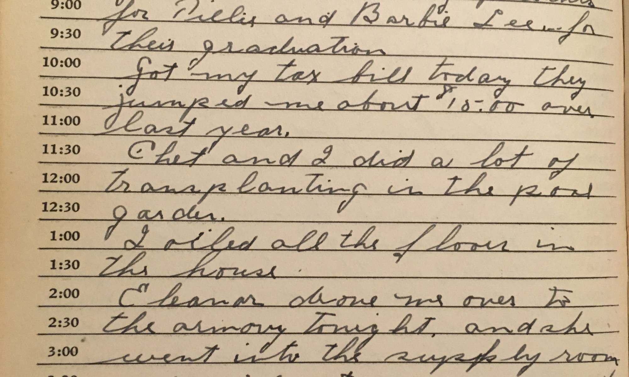 ToDay is the Birthday of Thel paid me $18.00 Rained today, wind So. Gave Thel $5.00 to buy present for Tillie and Barbie Lee for their graduation. Got my tax bill today. They jumped me about $15.00 over last year. Chet and I did a lot of transplanting in the pond garden. I oiled all …
