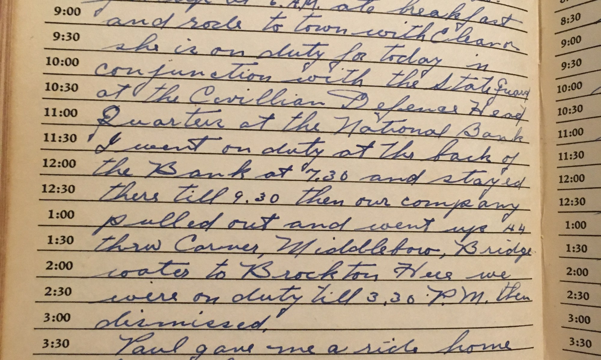 ToDay is the Birthday of Fair and warm, wind So. Got up at 6 a.m. Ate breakfast and rode to town with Eleanor. She is on duty for today in conjunction with the State Guard at the Civilian Defense Headquarters at the National Bank. I went on duty at the back of the Bank at …